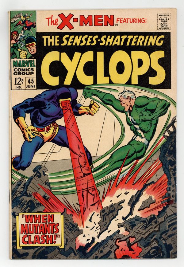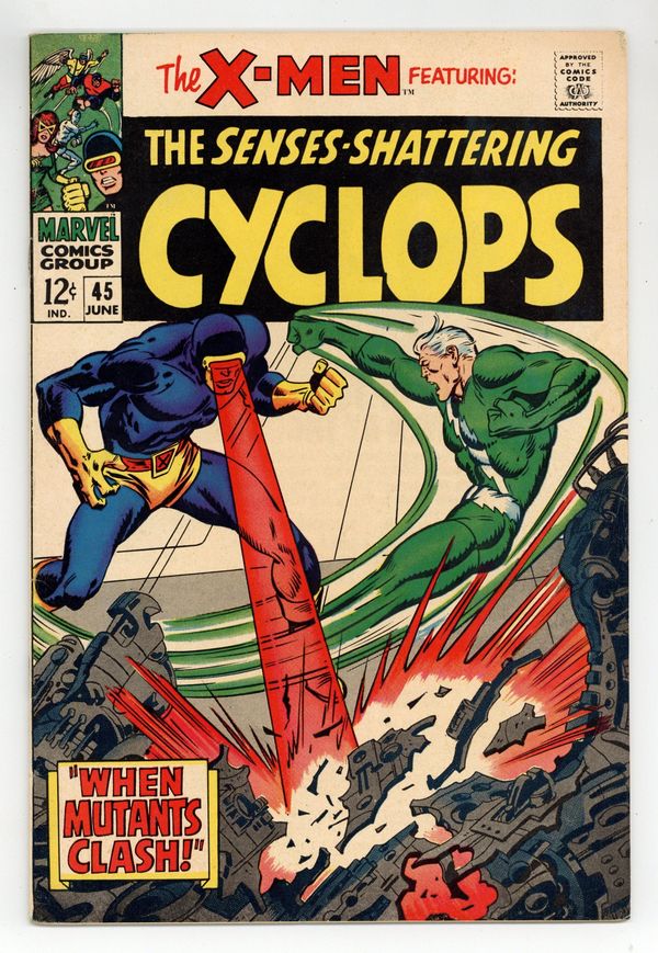 "When Mutants Clash!" Script by Gary Friedrich. Art by Don Heck (layouts), Werner Roth (pencils), and John Tartaglione (inks). Cover by John Buscema and George Tuska. Deep inside Magneto's island fortress, Cyclops realizes that he cannot wait any longer for the Angel to return! He has to break out of his cell now! And by narrowly focusing his powerful optic blasts he achieves his goal! However while Scott searches for Iceman and the Beast, a certain mutant speedster tracks his movements! When Pietro confronts the X-Men's leader, he gives him an opportunity to join Magneto's cause! But Scott refuses! And that means it's time for battle: Cyclops vs. Quicksilver! And the winner gets the Avengers next! Story concludes in Avengers #53. Appearances by the Scarlet Witch, Toad, and Marvel Girl. Avengers Lineup: Black Panther, Goliath (aka Hank Pym), Hawkeye, and the Wasp. Flashback cameo by Red Raven. Second story: "And the Mob Cried... Vengeance" Script by Gary Friedrich. Pencils by Werner Roth. Inks by John Verpoorten. This five-page story continues the origin of Iceman including his first meeting with Cyclops. (Note: This issue was reprinted in Uncanny X-Men #93 and also in Marvel Triple Action #45.) 36 pages. Cover price $0.12.