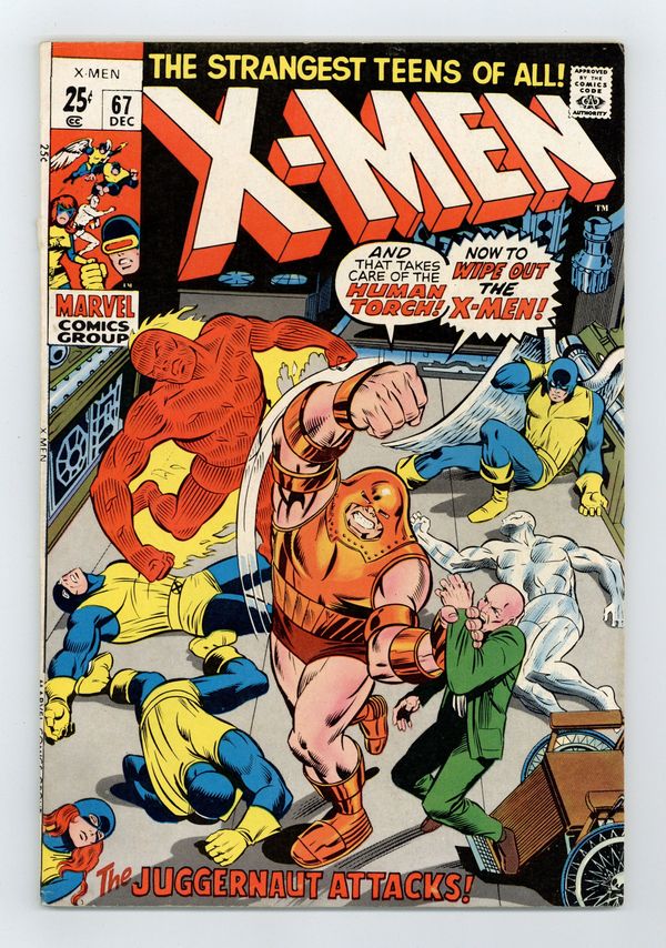 52-page Giant. Cover pencils by Marie Severin, inks by Joe Sinnott. The Origin of Professor X, script by Stan Lee, pencils by Jack Kirby and Alex Toth, inks by Vince Colletta; Cerebro detects a powerful mutant and Xavier fears that he knows who it is; The X-Men prepare the mansion for an all out assault; As the mysterious villain batters his way through the mansion's defenses, Professor X tells his students his origin story and how his step-brother changed from tormenting bully to an unstoppable Juggernaut; reprinted from issue 12. Where Walks the Juggernaut, script by Stan Lee, pencils by Jack Kirby and Werner Roth, inks by Joe Sinnott; reprinted from issue 13. 52 pgs. $0.25. Cover price $0.25.