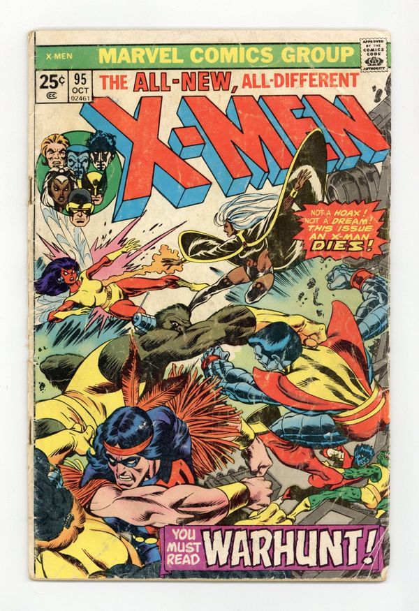 "Warhunt!" Part 2 of 2. Story by Chris Claremont and Len Wein. Art by Dave Cockrum and Sam Grainger. Cover by Gil Kane. In order to stop the sinister madman Count Nefaria from raining nuclear Armageddon down upon the world, the new X-Men must fight their way through the Count's mutated bodyguards - the Ani-Men! Plus, one X-Man makes the ultimate sacrifice! NOTE: Death of Thunderbird I. 36 pgs. Cover price $0.25.