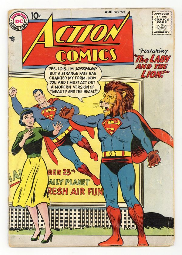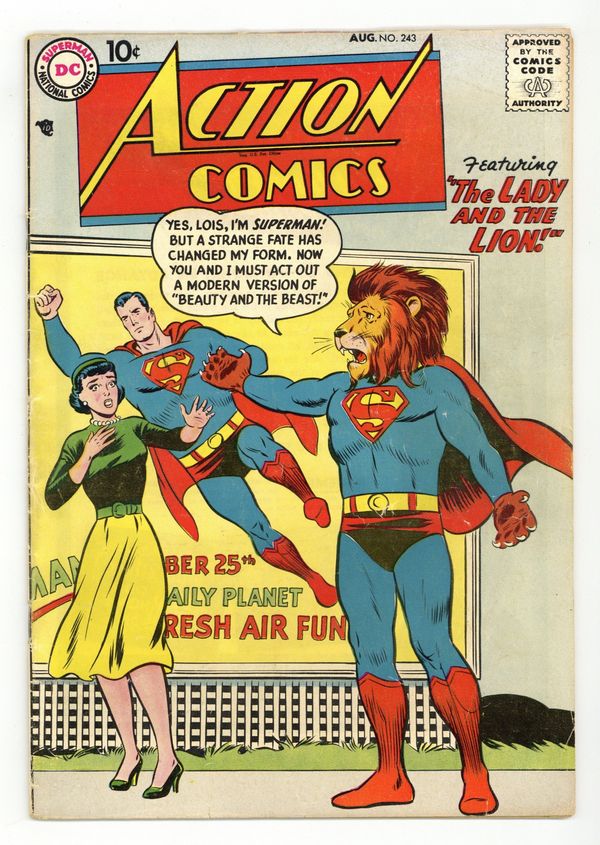 Cover pencils by Curt Swan, inks by Stan Kaye. "The Lady and the Lion," script by Otto Binder, pencils by Wayne Boring, inks by Stan Kaye; Circe gives Superman a potion that causes him to have the head of a lion until he discovers the antidote. 2/3-page Casey the Cop story by Henry Boltinoff. One-page Peg by Henry Boltinoff. "Puzzle of the Perilous Planetoid" starring Tommy Tomorrow, script by Otto Binder, art by Jim Mooney. One-page Varsity Vic story by Henry Boltinoff. "The Five From The Future" starring Congo Bill, art by Howard Sherman. 36 Pages, Full Color. $.10 Cover price $0.10.