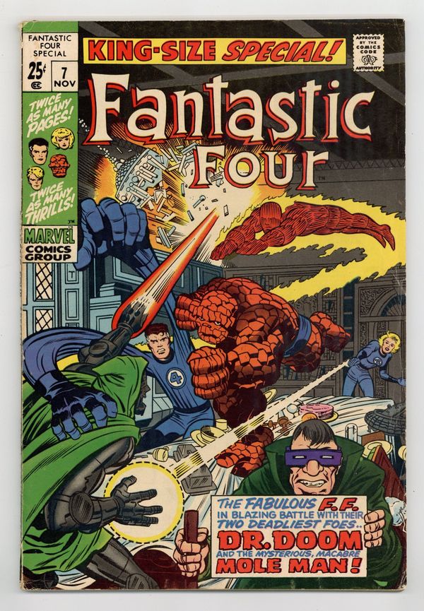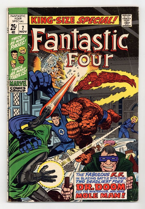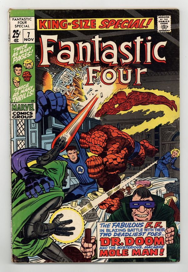 All Jack Kirby reprints: "The Fantastic Four Meet the Mole Man" (from FF 1), "Origin of Doctor Doom" and "The Final Victory of Dr. Doom" (FF Annual 2). This issue also contains four pages of black-and-white photos of 41 Marvel writers, artists, and staff members. New cover by Jack Kirby/Joe Sinnott. 68 pgs. Cover price $0.25.