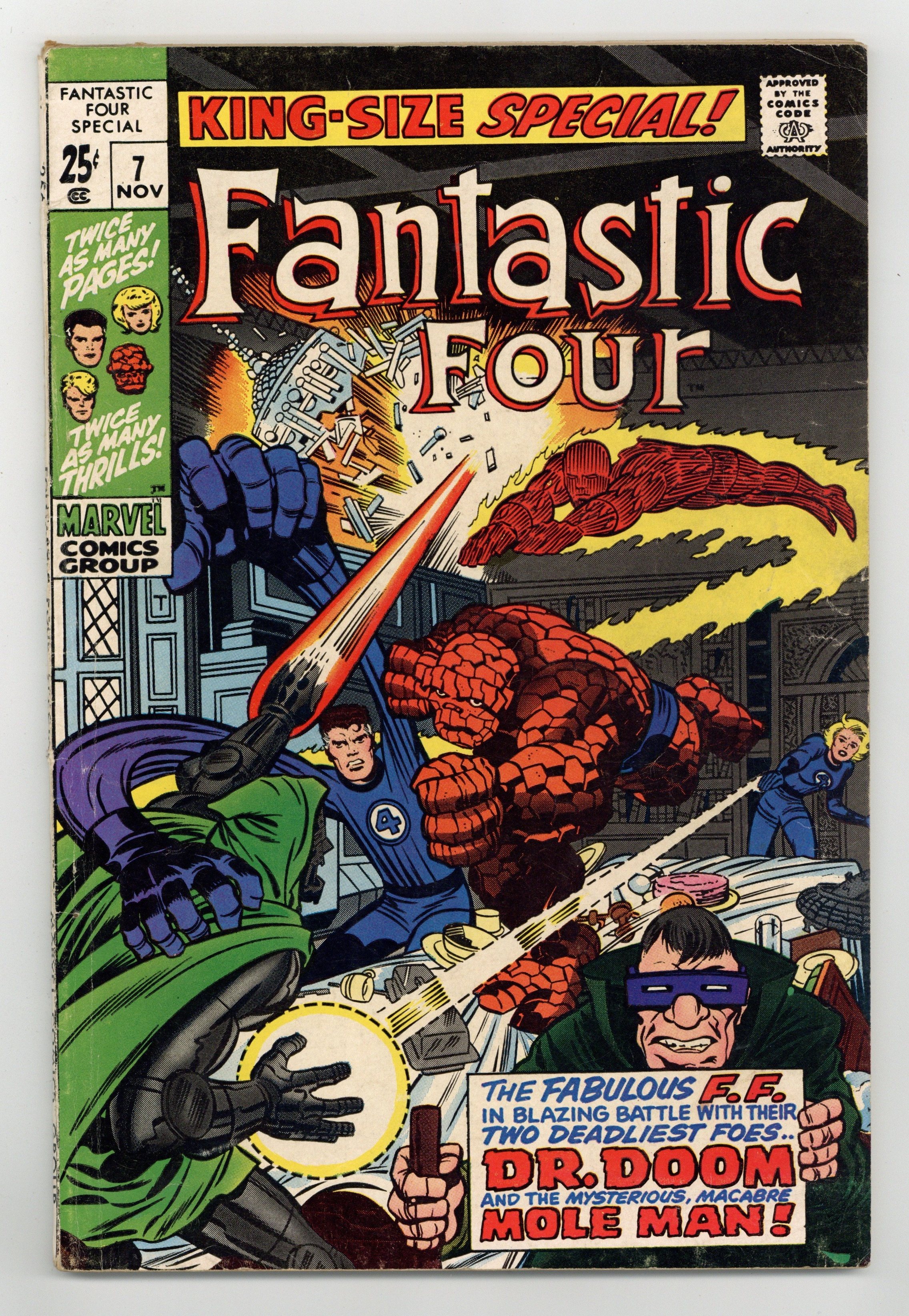 Tags: Fantastic Four$25.00All Jack Kirby reprints: "The Fantastic Four Meet the Mole Man" (from FF 1), "Origin of Doctor Doom" and "The Final Victory of Dr. Doom" (FF Annual 2). This issue also contains four pages of black-and-white photos of 41 Marvel writers, artists, and staff members. New cover by Jack Kirby/Joe Sinnott. 68 pgs. Cover price $0.25.