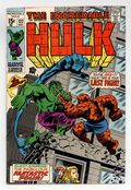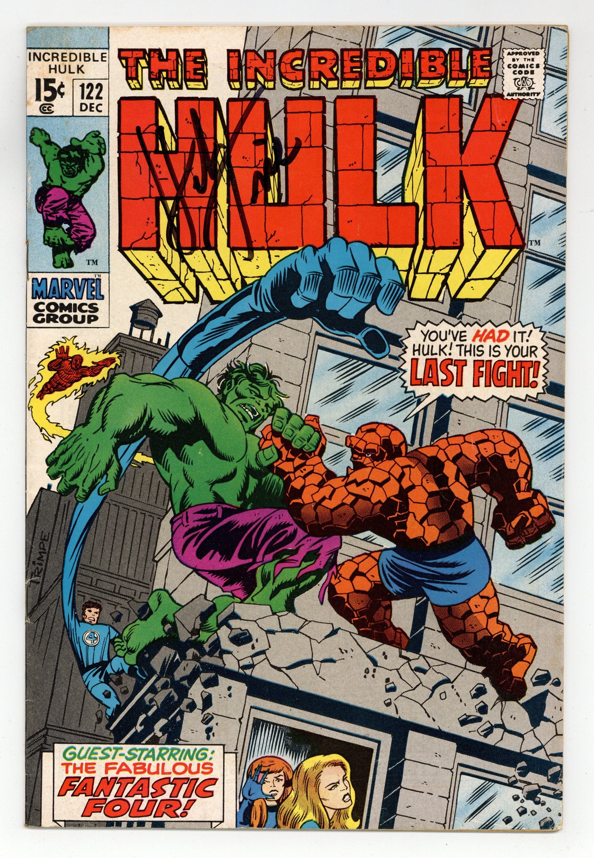 $52.00Cover art by Herb Trimpe. The Hulk's Last Fight!, script by Roy Thomas, art by Herb Trimpe; Despairing after he turns into his human alter ego and finds that the Hulk has destroyed a train for no apparent reason, Bruce Banner finds a newspaper headline that asks him to come to New York as Mr. Fantastic believes that he has discovered a way to do away with the Hulk for good; Riding the rails to the Big Apple, Bruce tries to jot some notes of his own regarding Reed's process and secures them to his waist as he finds himself transforming once again into the Hulk to face down some pesky hoboes; By the time he makes it to the Baxter Building, our hero is once again in the form of Bruce Banner but an irate security guard makes his metabolism race and he changes into his monstrous alter ego; During Hulk's battle with the F.F., Sue notices as the pouch with Bruce's notes falls from the Hulk's waist and the Thing is called on to keep the jade giant occupied while Reed uses the new information to modify his weapon design in trying to banish the Hulk for good. 36 pgs. $0.15. Cover price $0.15.