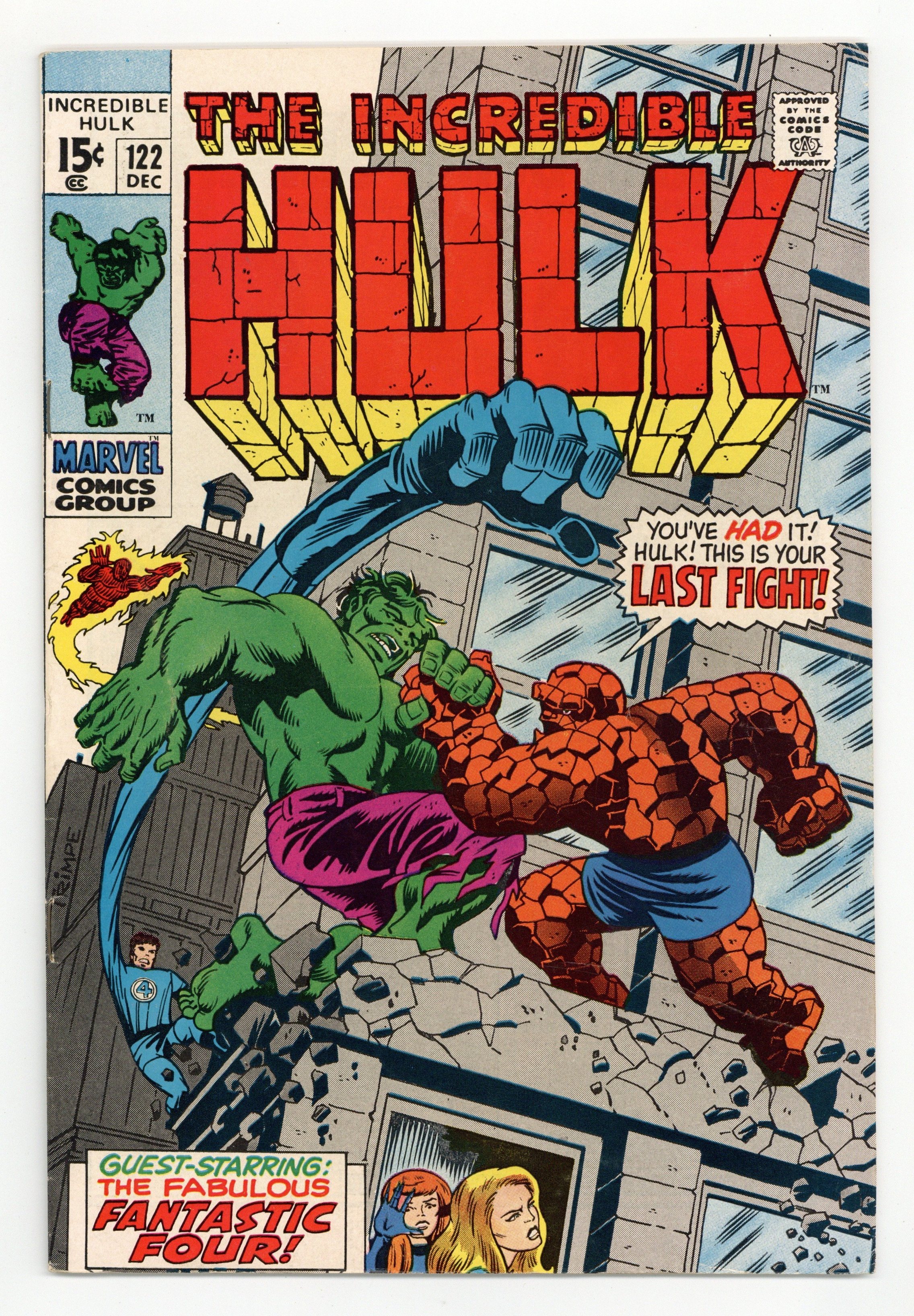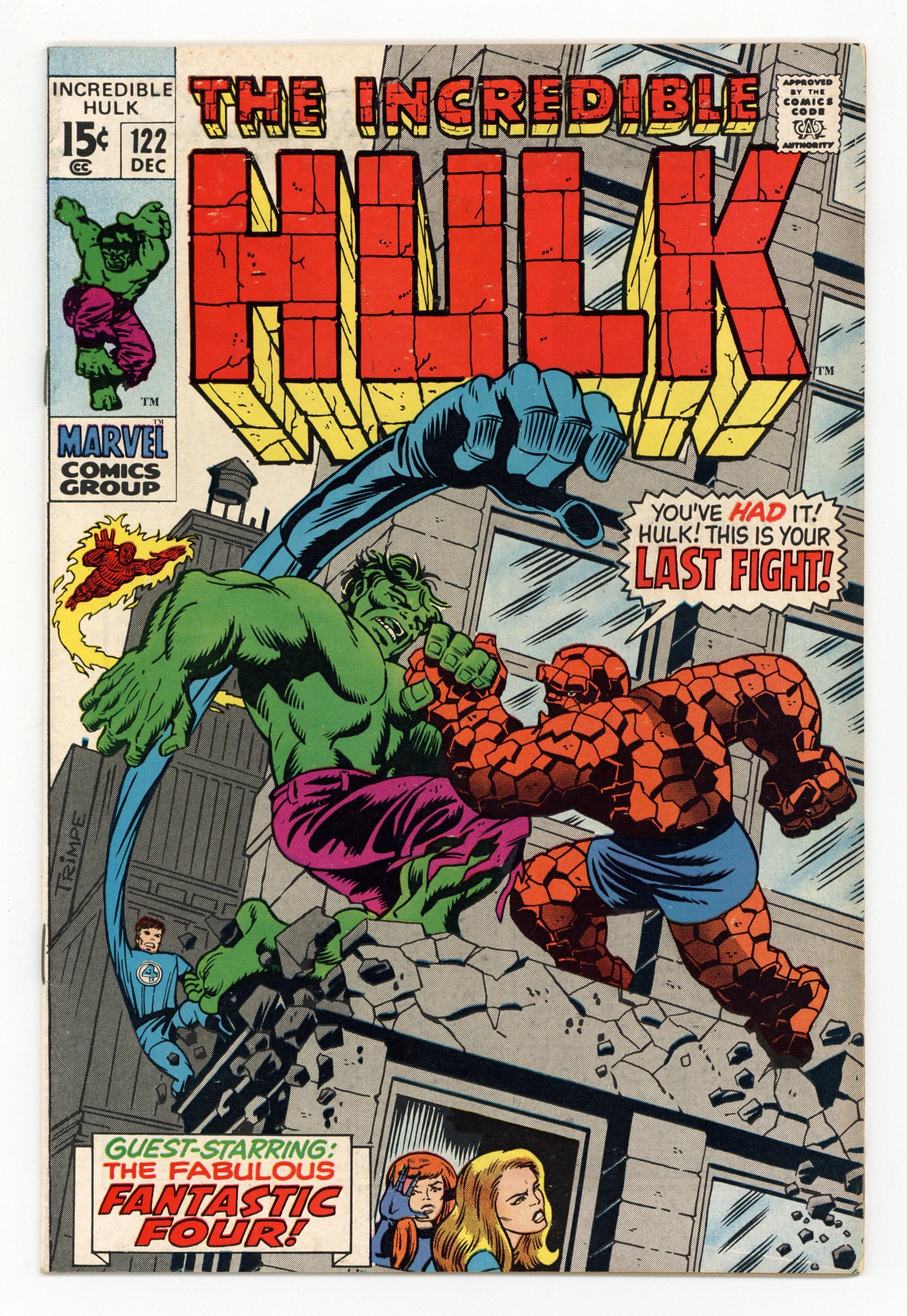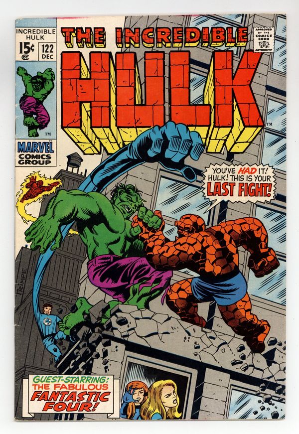 Cover art by Herb Trimpe. The Hulk's Last Fight!, script by Roy Thomas, art by Herb Trimpe; Despairing after he turns into his human alter ego and finds that the Hulk has destroyed a train for no apparent reason, Bruce Banner finds a newspaper headline that asks him to come to New York as Mr. Fantastic believes that he has discovered a way to do away with the Hulk for good; Riding the rails to the Big Apple, Bruce tries to jot some notes of his own regarding Reed's process and secures them to his waist as he finds himself transforming once again into the Hulk to face down some pesky hoboes; By the time he makes it to the Baxter Building, our hero is once again in the form of Bruce Banner but an irate security guard makes his metabolism race and he changes into his monstrous alter ego; During Hulk's battle with the F.F., Sue notices as the pouch with Bruce's notes falls from the Hulk's waist and the Thing is called on to keep the jade giant occupied while Reed uses the new information to modify his weapon design in trying to banish the Hulk for good. 36 pgs. $0.15. Cover price $0.15.