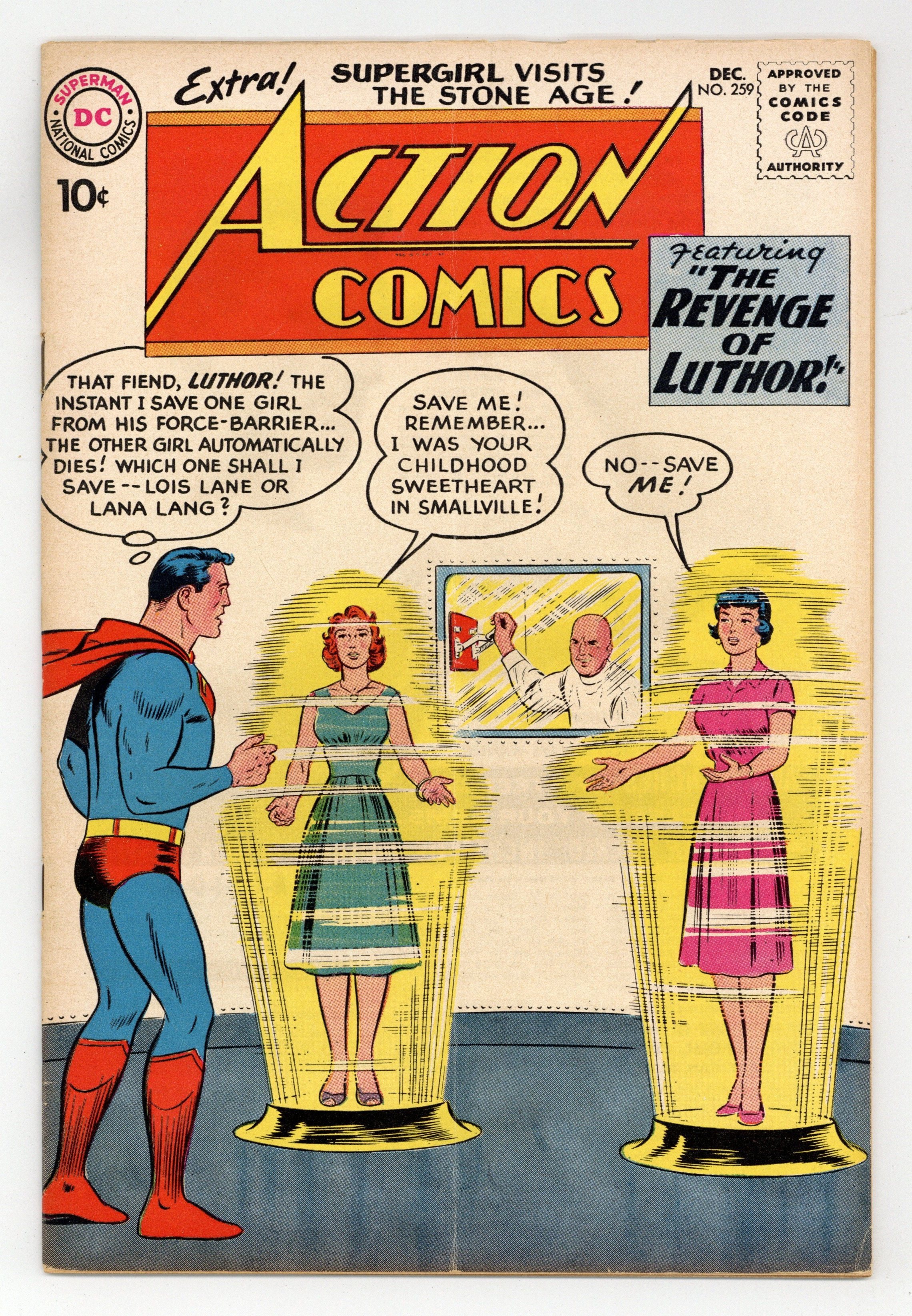 Cover pencils by Curt Swan, inks by Stan Kaye. "The Revenge of Luthor!", script by Jerry Siegel, art by Al Plastino; Exposure to Red Kryptonite seemingly causes Superman and Superboy to exist simultaneously. Luthor takes advantage by trapping Superboy and forcing Superman to choose between Lois and Lana. 2/3-page Shorty story by Henry Boltinoff. "The One-Ape Circus!", script by Robert Bernstein, art by Howard Sherman; Congorilla is captured by Nell Saxon and forced to perform in her circus. "The Cave-Girl of Steel!", script by Otto Binder, art by Jim Mooney; Supergirl visits the stone age so that she can practice using her powers openly. 36 Pages, Full Color. $.10 Cover price $0.10.