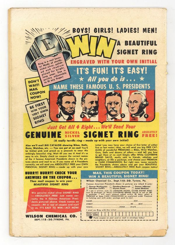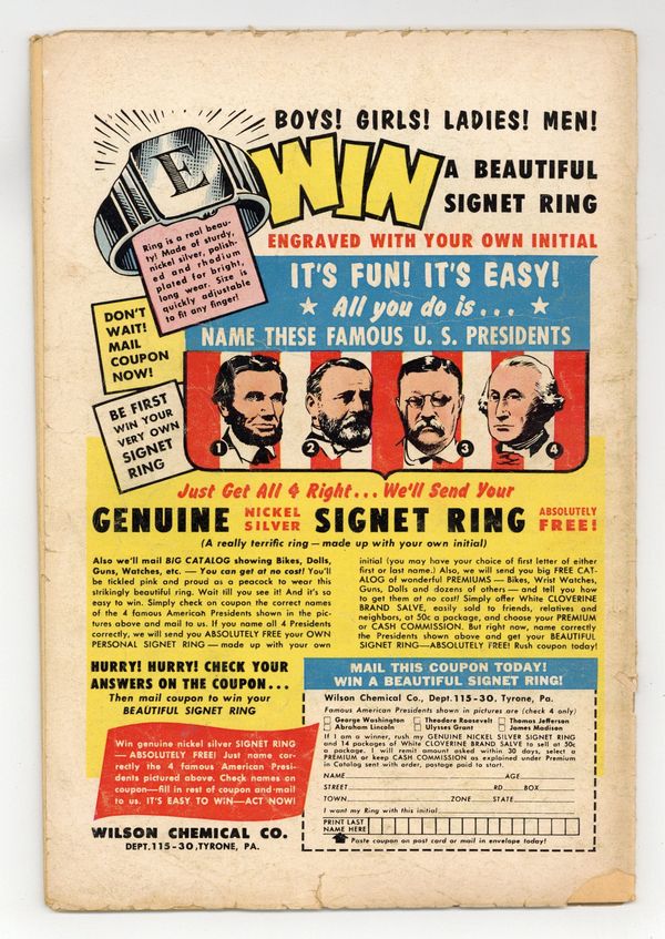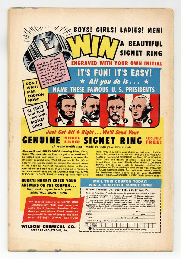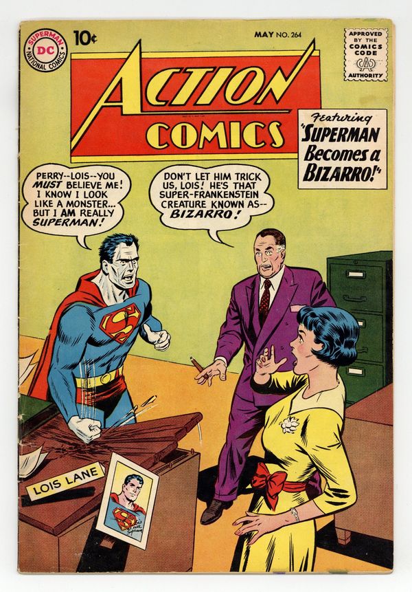 Cover pencils by Curt Swan, inks by Stan Kaye. "The Superman Bizarro!", script by Otto Binder, pencils by Wayne Boring, inks by Stan Kaye; Captured by the Bizarros on Bizarro World, Superman is sentenced to be turned into a Bizarro himself; He dreams what it would be like if the sentence was carried out. 2/3-page Ollie story by Henry Boltinoff. "Supergirl Gets Adopted!", script by Jerry Siegel, art by Jim Mooney; Linda has to scheme to prevent herself from being adopted to protect her secret identity; She spends 30 days with the Wilkins. One-page Professor Eureka story by Henry Boltinoff. 36 Pages, Full Color. $.10 "This is Part 2 of 4 of a running gag of covers that homage each other by legendary Superman artist Curt Swan that ran from 1958 to 1963. It is a series of covers I'm calling "The Desk Smash," and they appeared on the covers for Action Comics #237, 264, 284, and 302." – Odinson, mycomicshop.com Archivist. Cover price $0.10.