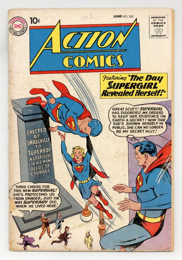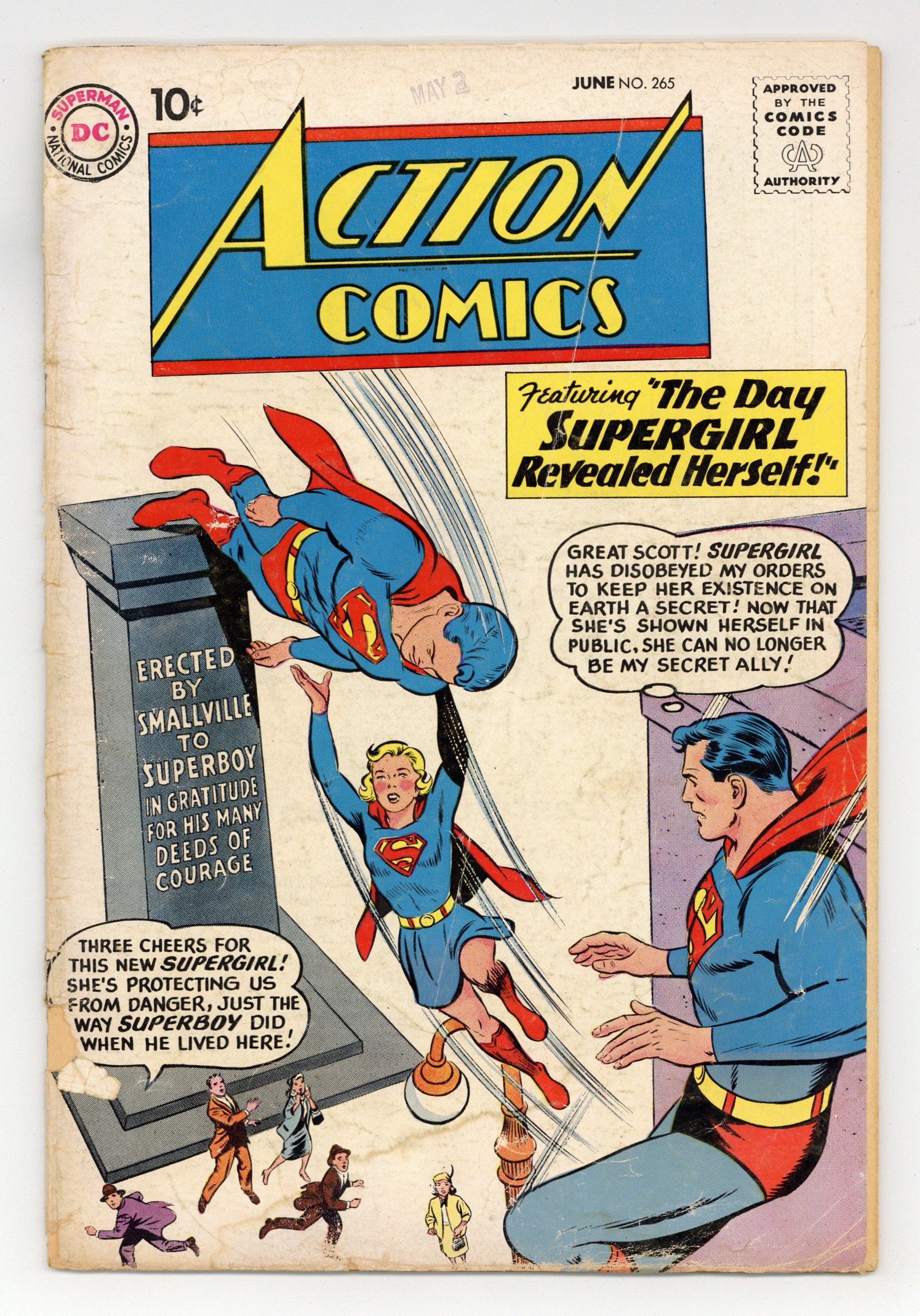 Cover pencils by Curt Swan. "The Superman from Outer Space!", script by Otto Binder, pencils by Curt Swan, inks by John Forte; Superman meets Hyper-Man from the parallel world of Oceania; When he discovers that Hyper-Man is dying, Superman arranges for his identity to be revealed so that he can spend his last year married to his girlfriend Lydia Long. -page Private Pete story by Henry Boltinoff. "The Day Supergirl Revealed Herself!", script by Jerry Siegel, art by Jim Mooney; A strange meteor gives Supergirl amnesia, so she uses her power openly in Smallville. 36 Pages, Full Color. $.10 Cover price $0.10.