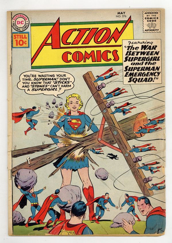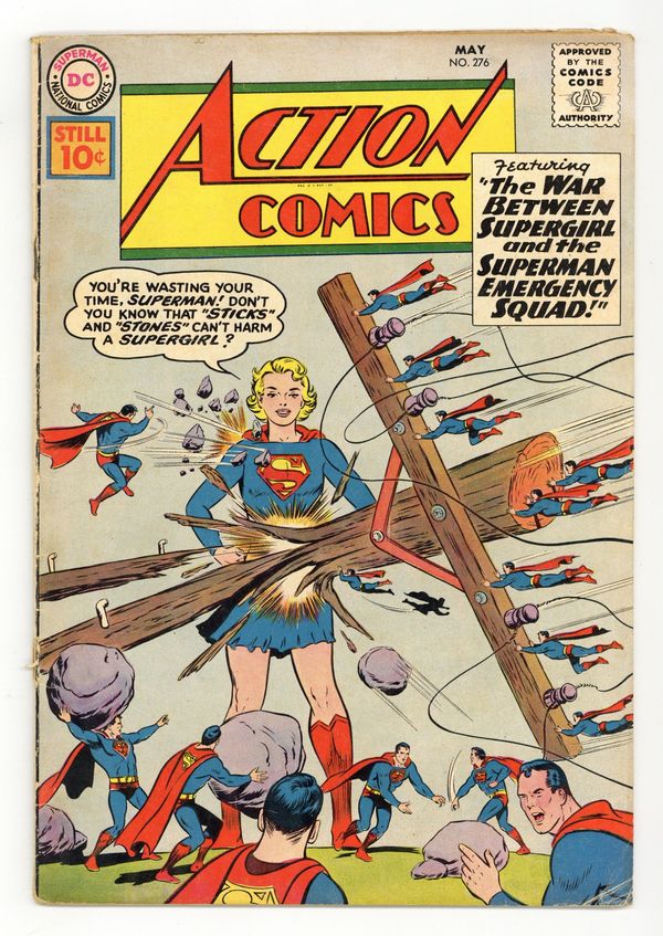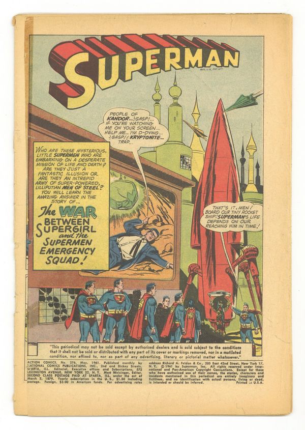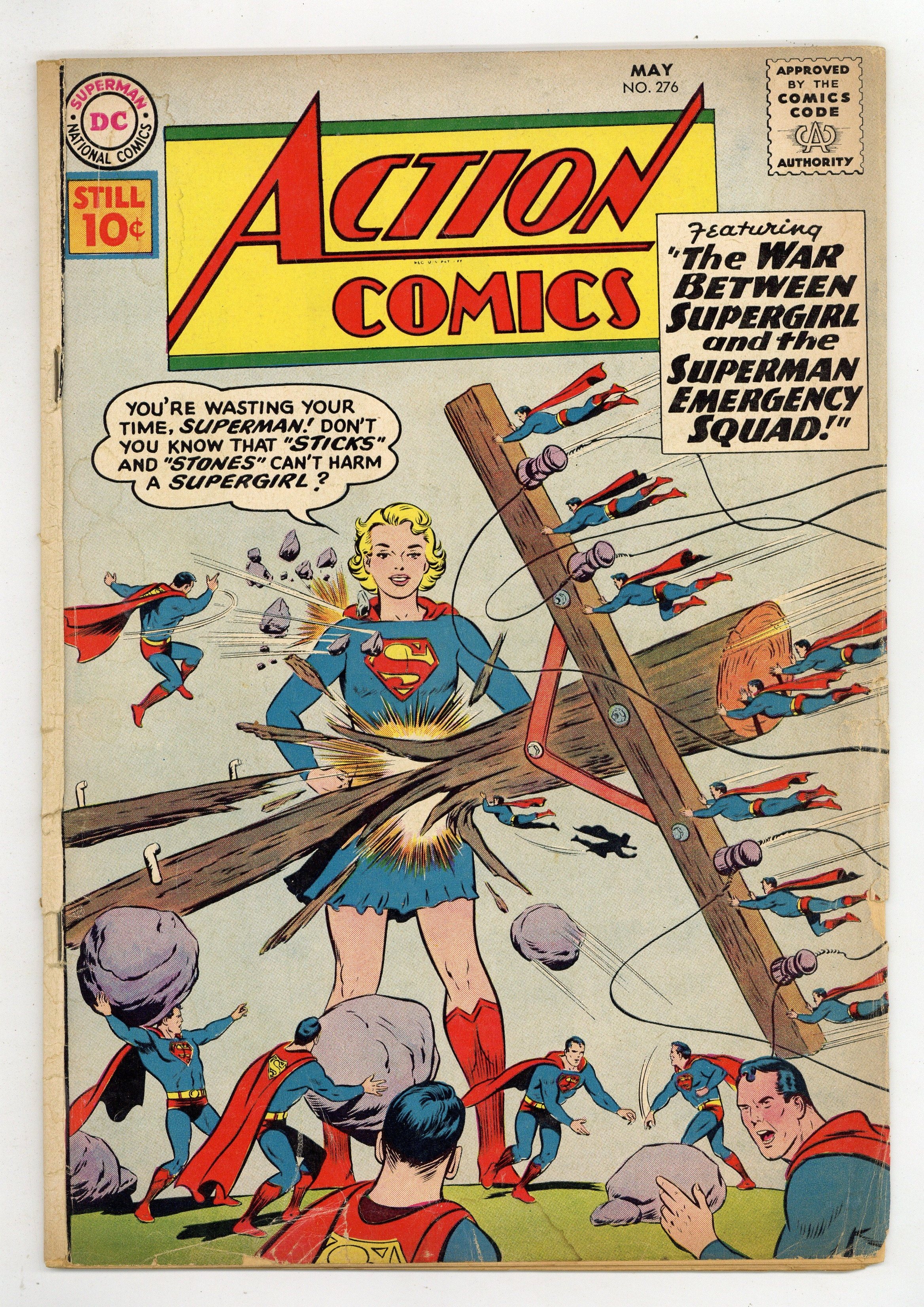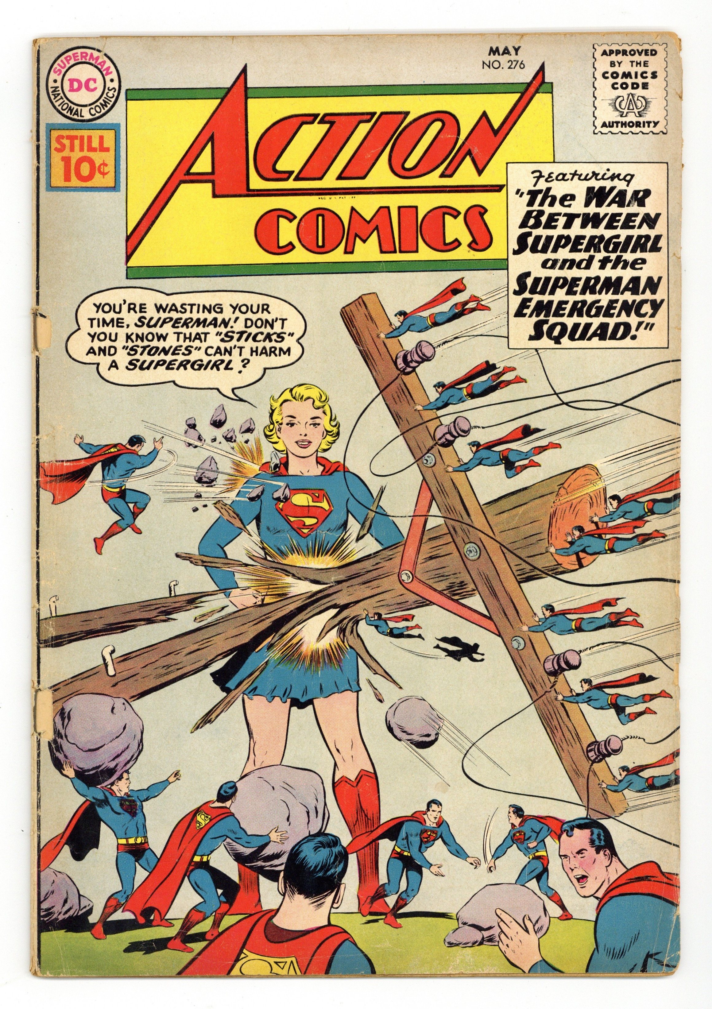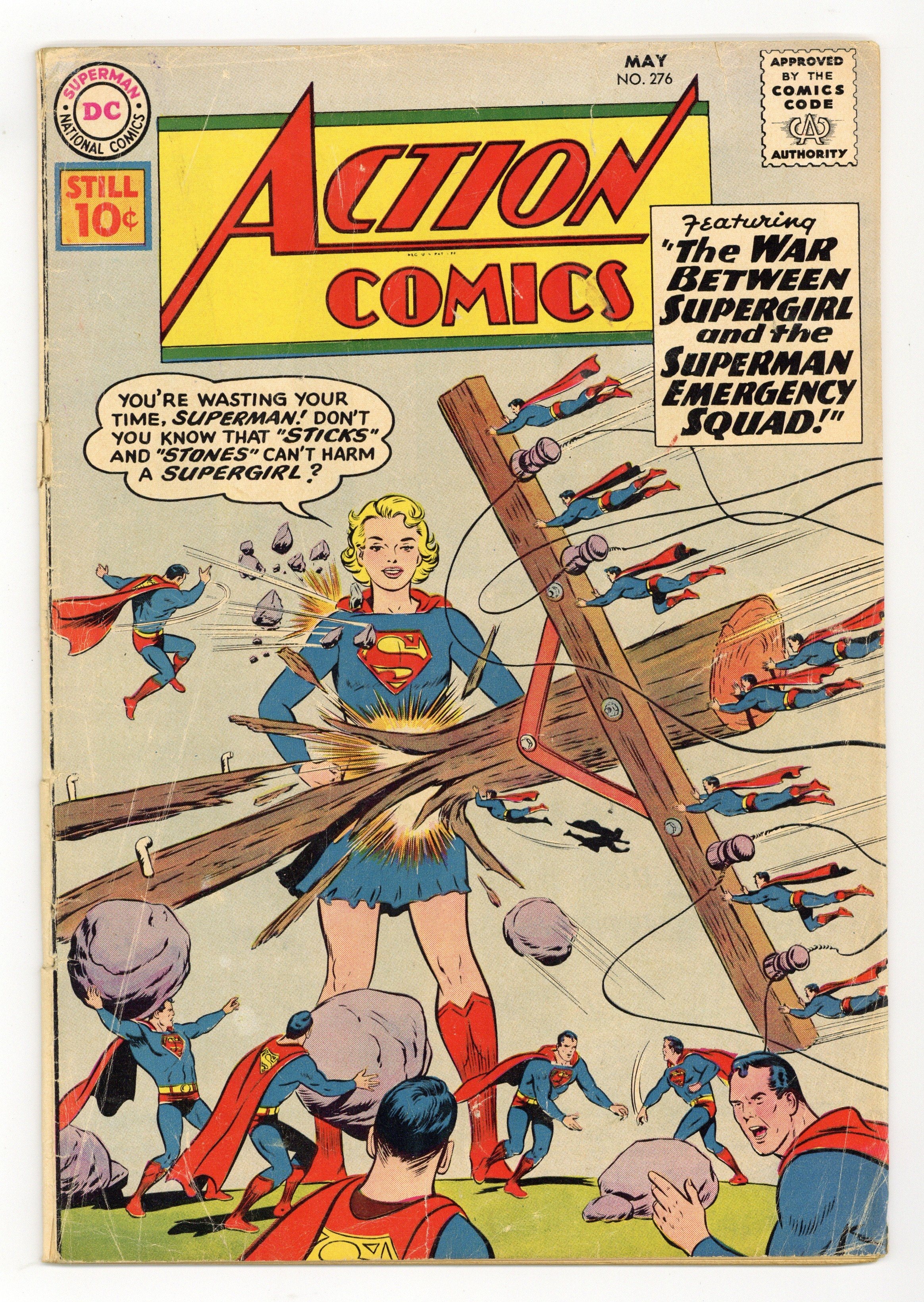 Cover pencils by Curt Swan, inks by Stan Kaye. "The War Between Supergirl and the Supermen Emergency Squad!", script by Robert Bernstein, pencils by Wayne Boring, inks by Stan Kaye; John Kiley tricks Superman into revealing he's Clark Kent; After trapping Clark Kent with Kryptonite, Supergirl and the Superman Emergency Squad spring into action. One-page Varsity Vic story by Henry Boltinoff. 1st appearance of Brainiac 5, Phantom Girl, Triplicate Girl, Bouncing Boy, Sun Boy, and Shrinking Violet in "Supergirl's Three Super Girl-Friends!", script by Jerry Siegel, art by Jim Mooney; Supergirl and Brainiac 5 join the Legion. 36 Pages, Full Color. $.10 Cover price $0.10.