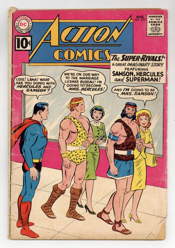 Cover pencils by Curt Swan, inks by Stan Kaye. "The Super-Rivals!", art by John Forte; In this imaginary tale, Lois Lane becomes engaged to Hercules and Lana Lang becomes engaged to Samson. Superman ad. Secret Origins ad. One-page Tricksy story by Henry Boltinoff. "Supergirl's Secret Enemy!", script by Jerry Siegel, art by Jim Mooney; Kandorian scientist Lesla-Lar uses her transporter ray to change places with Supergirl and becomes Lex Luthor's secret weapon. Batman and Robin ad. 36 Pages, Full Color. $.10 Cover price $0.10.