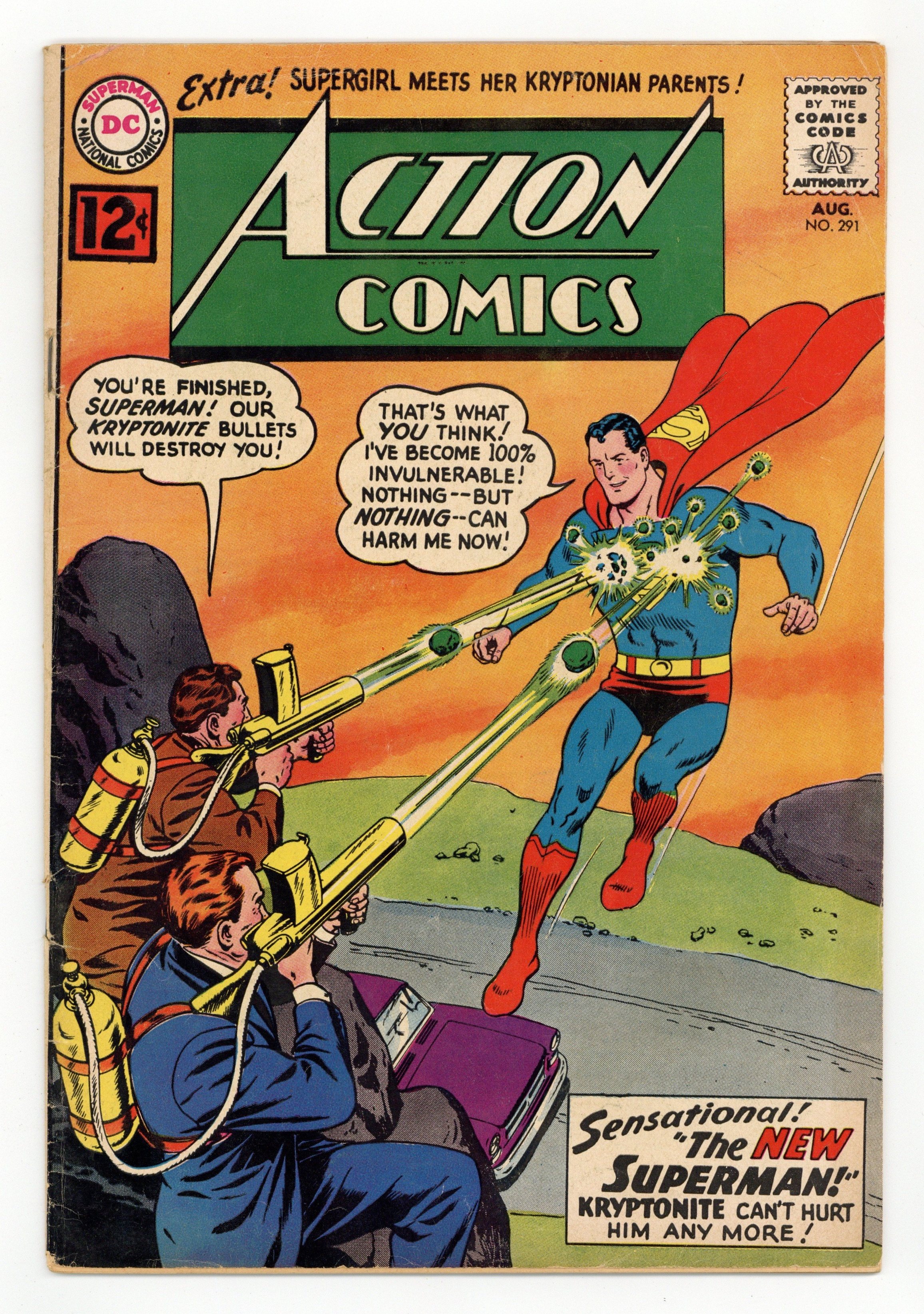 Cover pencils by Curt Swan, inks by George Klein. "The New Superman!", script by Robert Bernstein, art by Al Plastino; Red Kryptonite causes Superman to no longer be vulnerable to Green Kryptonite, but he is now vulnerable to other everyday objects. Supermen of America ad. Superman Krypton ad. 1st meeting of Supergirl and Mr. Mxyzptlk in "The Bride of Mr. Mxyzptlk!", script by Jerry Siegel, art by Jim Mooney; Mr. Mxyzptlk decides to pester Supergirl while Superman is away from Earth, so he first changes many people into Bizarros and then restores Supergirl's Kryptonian parents to life, before deciding that Supergirl should marry him. Batman and Robin ad. Lois Lane ad. 36 Pages, Full Color. $0.12 Cover price $0.12.