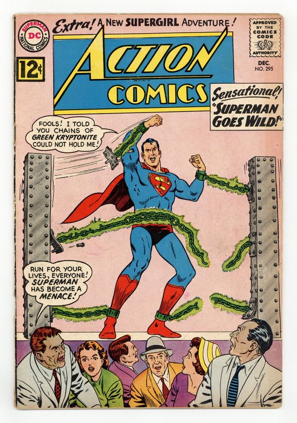 Cover pencils by Curt Swan, inks by John Forte. "Superman Goes Wild!", script by Robert Bernstein, pencils by Curt Swan, inks by George Klein; The Superman Revenge Squad uses a telepathic signal to hypnotize Superman into doing evil deeds; He finally creates a ruse to convince the Squad he is mad, and unleashes the Superman Emergency Squad from Kandor to attack the Revenge Squad members, who destroy themselves. One-page Jerry The Jitterbug story by Henry Boltinoff. "The Girl With the X-Ray Mind!", script by Leo Dorfman, art by Jim Mooney; Lena demonstrates E.S.P. talents but is denied a job with the FBI, so Supergirl goes into the past to find more information on her to help her get the job. She finds Lena is really Lex Luthor's little sister and one of his experiments accidentally gave her telepathic powers. Superman stars in a one-page public service announcement, "Pennies for UNICEF!" 36 Pages, Full Color. $0.12 Cover price $0.12.