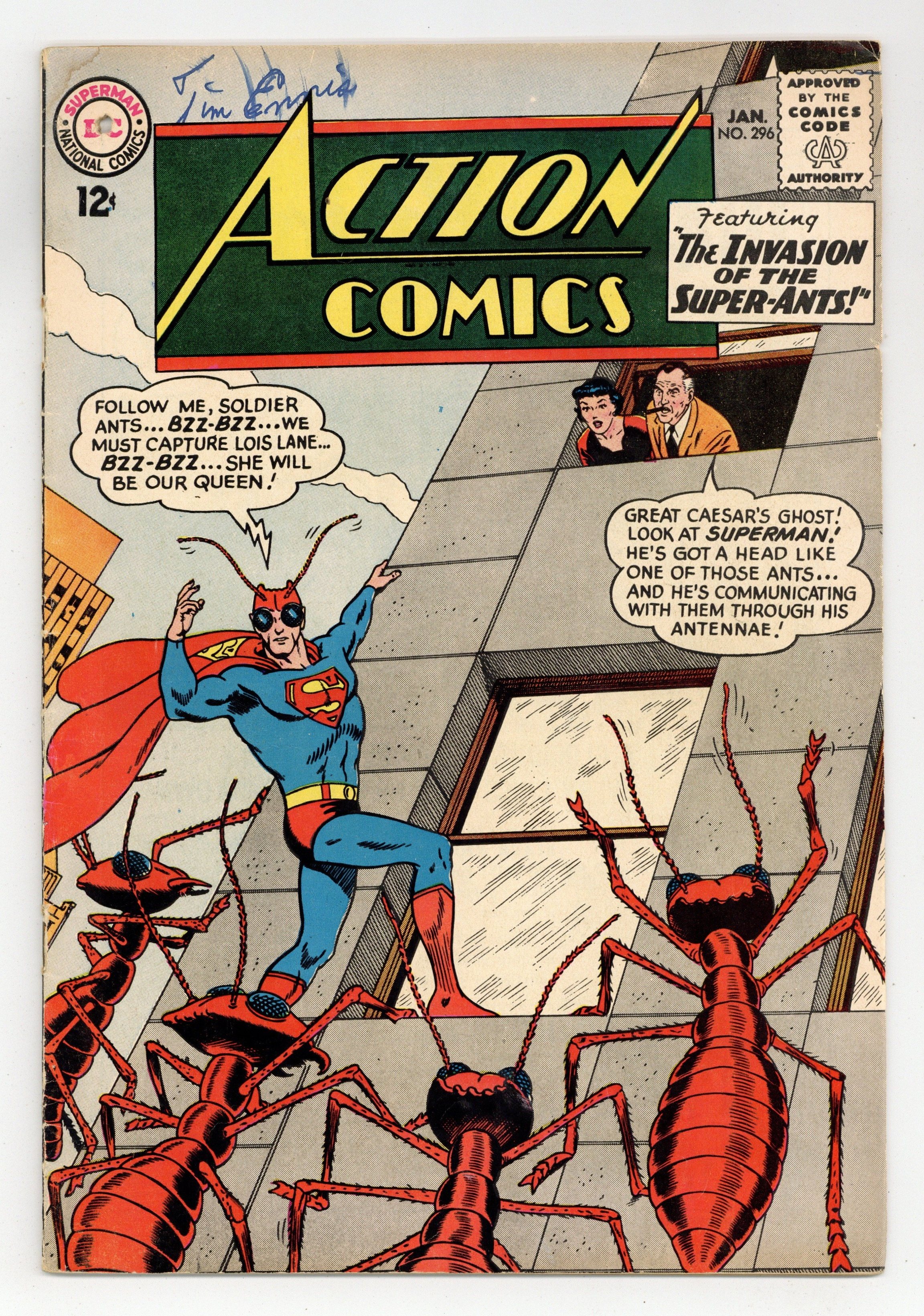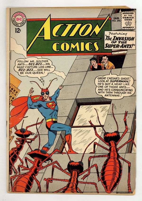 Cover pencils by Curt Swan, inks by George Klein. "The Invasion of the Super-Ants!", art by Al Plastino; When giant ants invade Metropolis, Superman uses Red Kryptonite to alter his head to resemble an ant's, so that he can communicate with the ants, who have kidnapped Lois Lane. One-page Cora the Car Hop story by Henry Boltinoff. Supermen of America ad. Superman ad. Batman and Robin ad. "The Girl Who Was Supergirl's Double!", script by Leo Dorfman, art by Jim Mooney; A series of coincidental events lead Dick to believe that Lena is really Supergirl, and he begins to pay her extra attention, which makes Linda jealous. Rudolph the Red-Nosed Reindeer comic book ad. 36 Pages, Full Color. $0.12 Cover price $0.12.