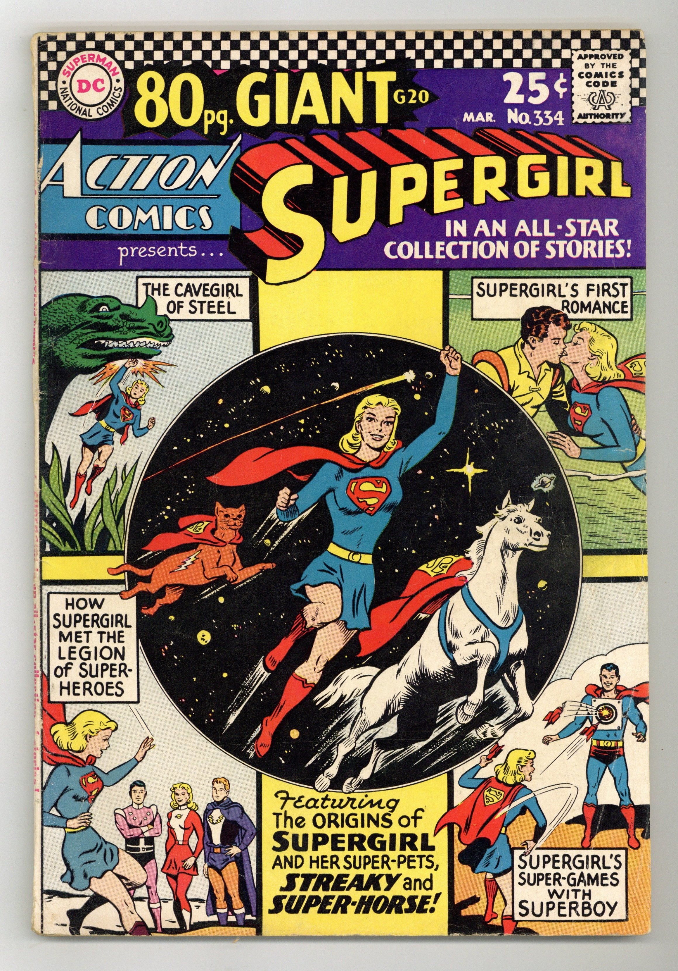 Tags: Superman$23.0080-page Giant G-20; reprints origins of Supergirl, Streaky, Superhorse, and the Legion of Super-Heroes. Cover pencils by Jim Mooney (central image) and Curt Swan (surrounding images). "The Supergirl from Krypton!", script by Otto Binder, art by Al Plastino; Superman spies a crashing rocket and discovers his cousin Supergirl; She tells him how Argo City survived the destruction of Krypton and how her father sent her to Earth when the inhabitants of Argo City were threatened by Kryptonite poisoning. The Spectre ad. "The Cave-Girl of Steel," script by Otto Binder, art by Jim Mooney; Supergirl visits the stone age so that she can practice using her powers openly. "Supergirl's First Romance!", script by Jerry Siegel, art by Jim Mooney. "Supergirl's Super-Pet," script by Jerry Siegel, art by Jim Mooney. Supergirl's Two Sets of Parents article. "Supergirl's Fortress of Solitude!", script by Jerry Siegel, art by Jim Mooney. "The Three Super-Heroes," script by Jerry Siegel, art by Jim Mooney. "Superboy Meets Supergirl!", script by Jerry Siegel, art by Curt Swan. "The Super-Steed of Steel," script by Leo Dorfman, art by Jim Mooney. Short text features, "When Supergirl Met Jimmy Olsen," "Supergirl's Two Sets of Parents," and "The Origin of Super-Horse." 84 Pages, Full Color. $0.25 Cover price $0.25.