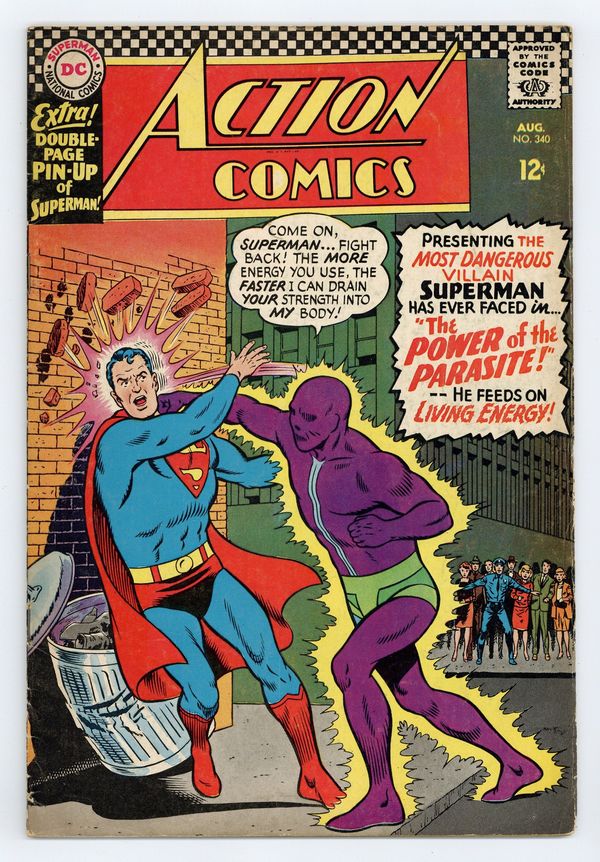 Cover pencils by Curt Swan, inks by George Klein. Origin and 1st appearance of Parasite in "Power of the Parasite!", script by Jim Shooter, art by Al Plastino; Exposed to radioactive waste, lab worker Jensen becomes the Parasite, who has the ability to absorb energy from all living beings, including Superman. Superman's Pal, Jimmy Olsen ad. "The Supergirl Identity Hunt!", art by Jim Mooney; The Fact Finder, a professional blackmailer, has deduced that Supergirl was once associated with the Midvale Orphanago, and he uses the opportunity of a reunion there to try and figure out her secret identity. Superman centerspread pin-up by Curt Swan. 36 Pages, Full Color. $0.12 Cover price $0.12.