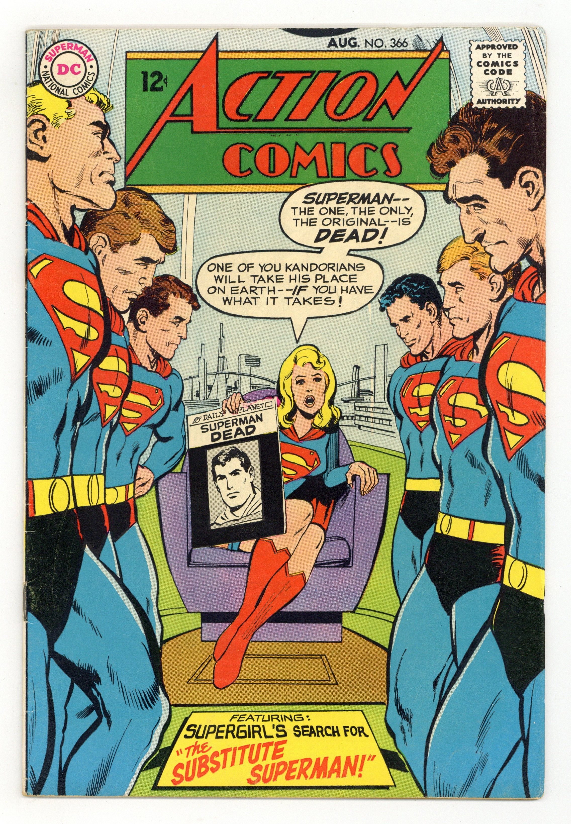 Cover by Neal Adams. "Substitute Superman!", script by Leo Dorfman, pencils by Ross Andru, inks by Mike Esposito; Superman is cured of Virus X because the Bizarros exposed him to White Kryptonite, which destroyed the plant-like bacterial infection; However, when he returns to Earth he learns that no one is still in mourning, because his Justice League friends have been masquerading as him. Superman's Pal, Jimmy Olsen ad. "Stanhope - Off Limits!", script by Cary Bates, art by Kurt Schaffenberger; Two women with super-scientific weapons construct a dome over Stanhope College that will set off a bomb if Supergirl uses her powers against it, keeping her out of the way while they search for one particular student. 36 Pages, Full Color. $0.12 Cover price $0.12.