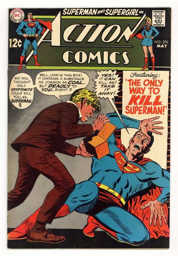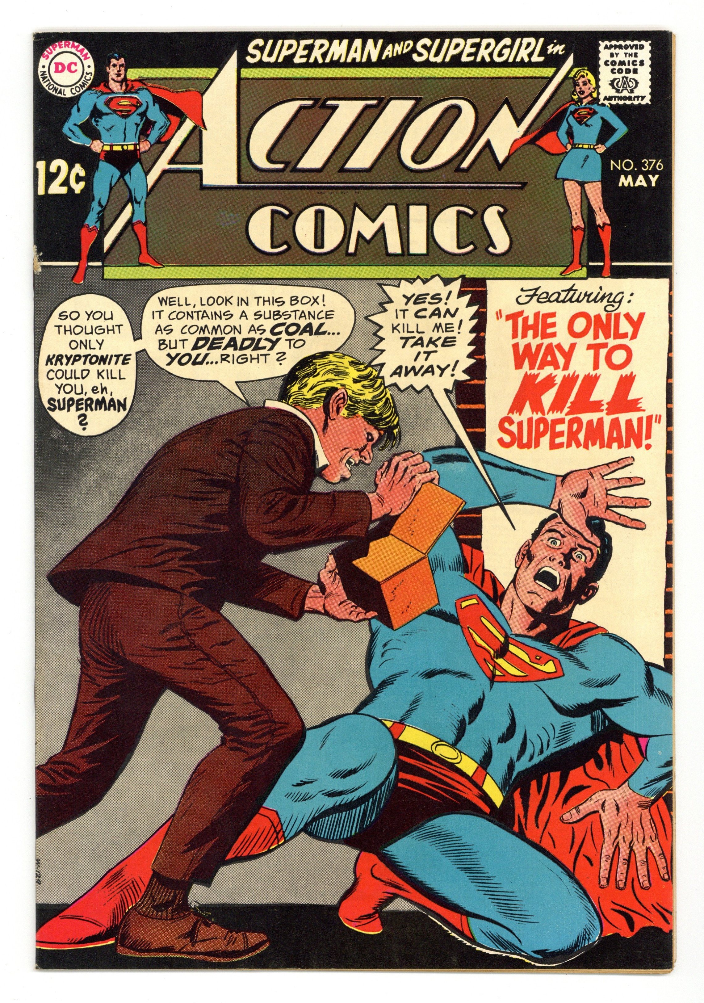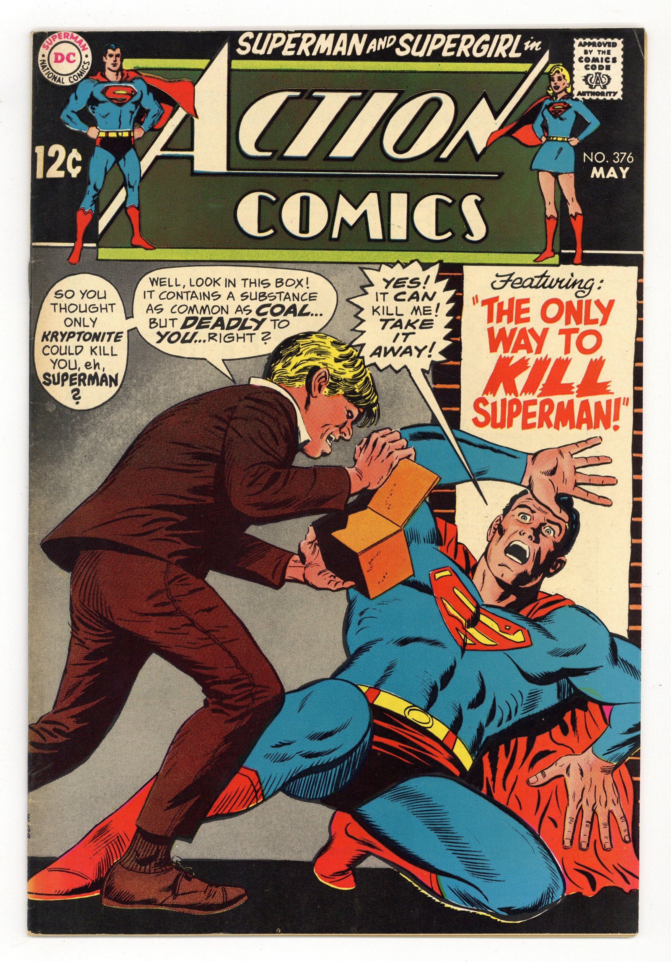 Last 12-cent cover price. Cover pencils by Curt Swan, inks by Mike Esposito. "The Only Way to Kill Superman!", script by Otto Binder, pencils by Curt Swan, inks by Jack Abel; The Anti-Superman Gang tries several different scientific weapons against Superman until one left him caught in a Kryptonite trap. Superboy ad. Hawkman ad. Nightmaster ad. Last Supergirl story in Action Comics, "The Hated Girl of Steel," art by Kurt Schaffenberger; Scientists attending a conference at Stanhope College are kidnapped by aliens from the planet Rancor who want to steak their collective knowledge; Supergirl learns that they were also responsible for the blinding of Dr. Alexander. Legion of Super-Heroes ad. One-page "DC Stars of Stage, Screen, Radio, and Television" article on media adaptations of Superman, Batman, and other DC characters. 36 Pages, Full Color. $0.12 Cover price $0.12.