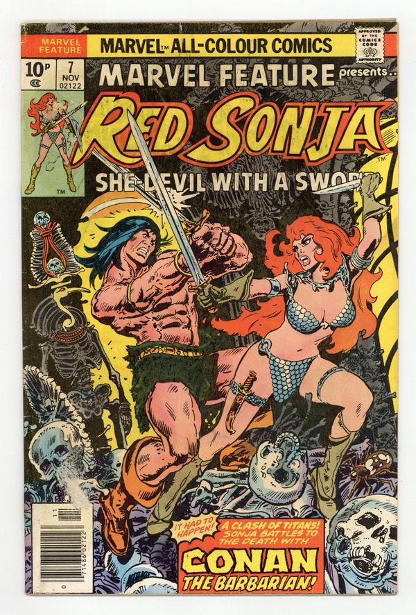 UK edition. Identical to US edition, but has 10p cover price. Cover art by Frank Thorne. "The Battle of the Barbarians!", script by Roy Thomas, art by Frank Thorne; Red Sonja delivers a stolen page from the Book of Skelos to Karanthes, but Conan has tracked her there and wants the page for himself. Hostess snack cakes ad featuring Spider-Man. 36 pgs., full color.