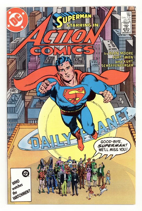 Direct Edition. Cover pencils by Ed Hannigan (layouts) and Curt Swan (as Swanderson), inks by Murphy Anderson (as Swanderson). "Whatever Happened to the Man of Tomorrow?", script by Alan Moore, pencils by Curt Swan, inks by Kurt Schaffenberger and Murphy Anderson (uncredited); Lois continues to relate how when Superman was holed up in the Fortress with his closest friends, being attacked by Brainiac (having taken over Luthor's body), the Kryptonite Man, and the Legion of Super-Villains, he realized who the mastermind behind it all was, and called on Mr. Mxyzptlk to show himself; Just as Superman sent Mxyzptlk into the Phantom Zone, Mxy fled to his own dimension, tearing himself apart; Having taken a life, Superman exposed himself to gold kryptonite and retired. Legendary story continued from Superman #423. Superman in Action article by E. Nelson Bridwell; The history of Superman in Action Comics. 36 Pages, Full Color, $0.75. Cover price $0.75.