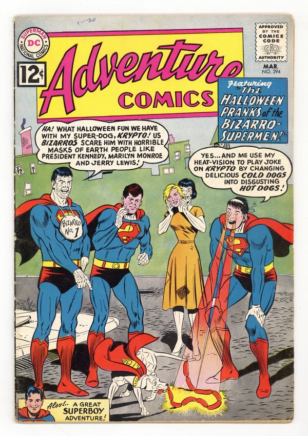Tags: Bizarro$36.00Cover pencils by Curt Swan, inks by George Klein. Dial M for Monster, script by Jerry Siegel, art by Al Plastino; Aliens from Xnor come to visit Earth as tourists and are very annoying. Tricksy humor page by Henry Boltinoff. Halloween Pranks of the Bizarro-Supermen--Tales of the Bizarro World, script by Jerry Siegel, art by John Forte; On Bizarro world, it's the adults who wear masks and play pranks on Halloween; But when Bizarro No. 1 plays cruel tricks on him, Bizarro Krypto searches for a better companion; 1st Bizarro Marilyn Monroe, Bizarro President John F. Kennedy, and Bizarro Jerry Lewis. 36 pages, Full Color. Cover price $0.12.