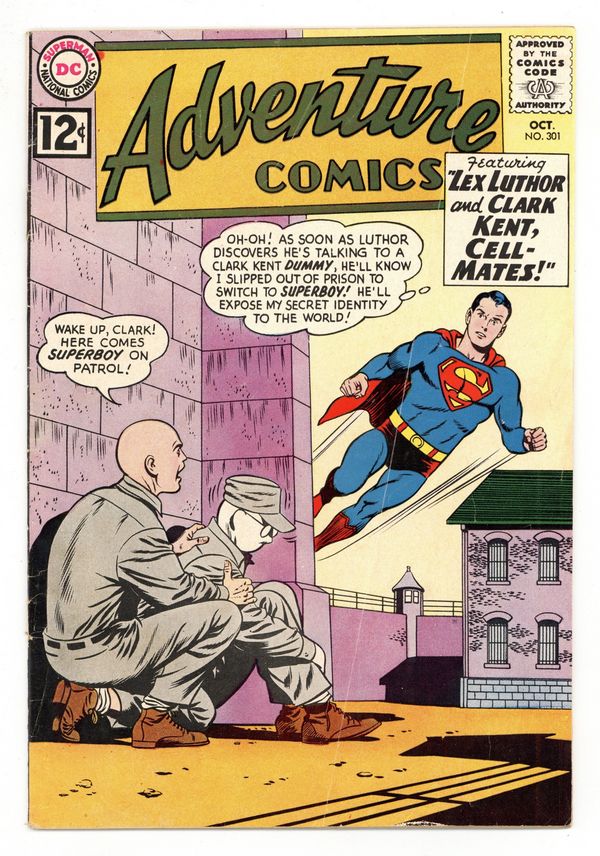 Cover pencils by Curt Swan, inks by Sheldon Moldoff. Lex Luthor and Clark Kent: Cell-Mates!, script by Edmond Hamilton, pencils by Curt Swan, inks by George Klein; Lex Luthor frames Clark Kent after Clark's father, as a member of the parole board, refuses to parole Luthor. Clark ends up having to share a cell with Luthor. The Secret Origin of Bouncing Boy--Tales of the Legion of Super-Heroes, script by Jerry Siegel, art by John Forte; Bouncing Boy tells a group of applicants how he got his powers and gained acceptance into the Legion. 36 pages, Full Color. Cover price $0.12.