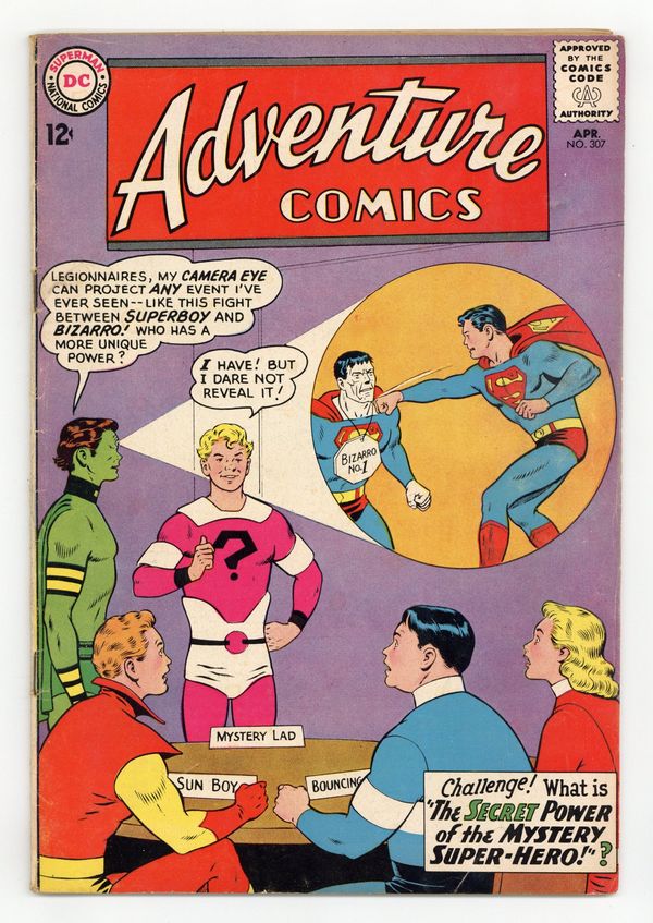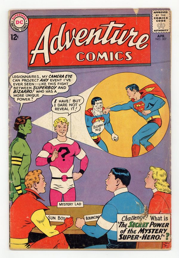 Cover pencils by Curt Swan, inks by George Klein. The Confession of Superboy!, art by George Papp; Lana tries to prove Clark is Superboy. The Secret Power of the Mystery Super-Hero!--Tales of the Legion of Super-Heroes, script by Edmond Hamilton, art by John Forte; The Legion takes in new member Mystery Lad on Saturn Girl's word and he helps them put an end to space pirate Roxxas; 1st appearance of Element Lad. Casey the Cop humor half-page by Henry Boltinoff. 36 pages, Full Color. Cover price $0.12.