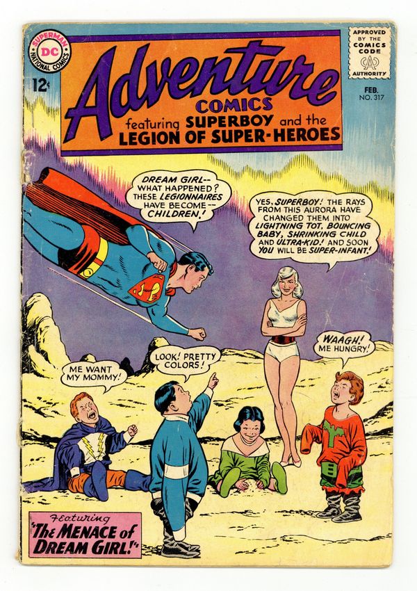 Cover pencils by Curt Swan, inks by George Klein. Part I: The Menace of Dream Girl!--Tales of the Legion of Super-Heroes, script by Edmond Hamilton, art by John Forte; Dream Girl joins the Legion and insists Lightning Lass be expelled when she loses her powers and demands Triplicate Girl be court-martialed for accusing her of causing Lightning Lass to lose her power. Super-Turtle humor page by Henry Boltinoff. Part II: The Doom of the Legion!--Tales of the Legion of Super-Heroes, script by Edmond Hamilton, art by John Forte; Even more Legionnaires are expelled before Dream Girl reveals to Star Boy that it was all a plot to prevent their deaths. In this two-parter, Lightning Lass becomes Light Lass, and the Hall of Fame series begins.The Shrinking of Superboy, art by John Sikela. 36 pages, Full Color. Cover price $0.12.