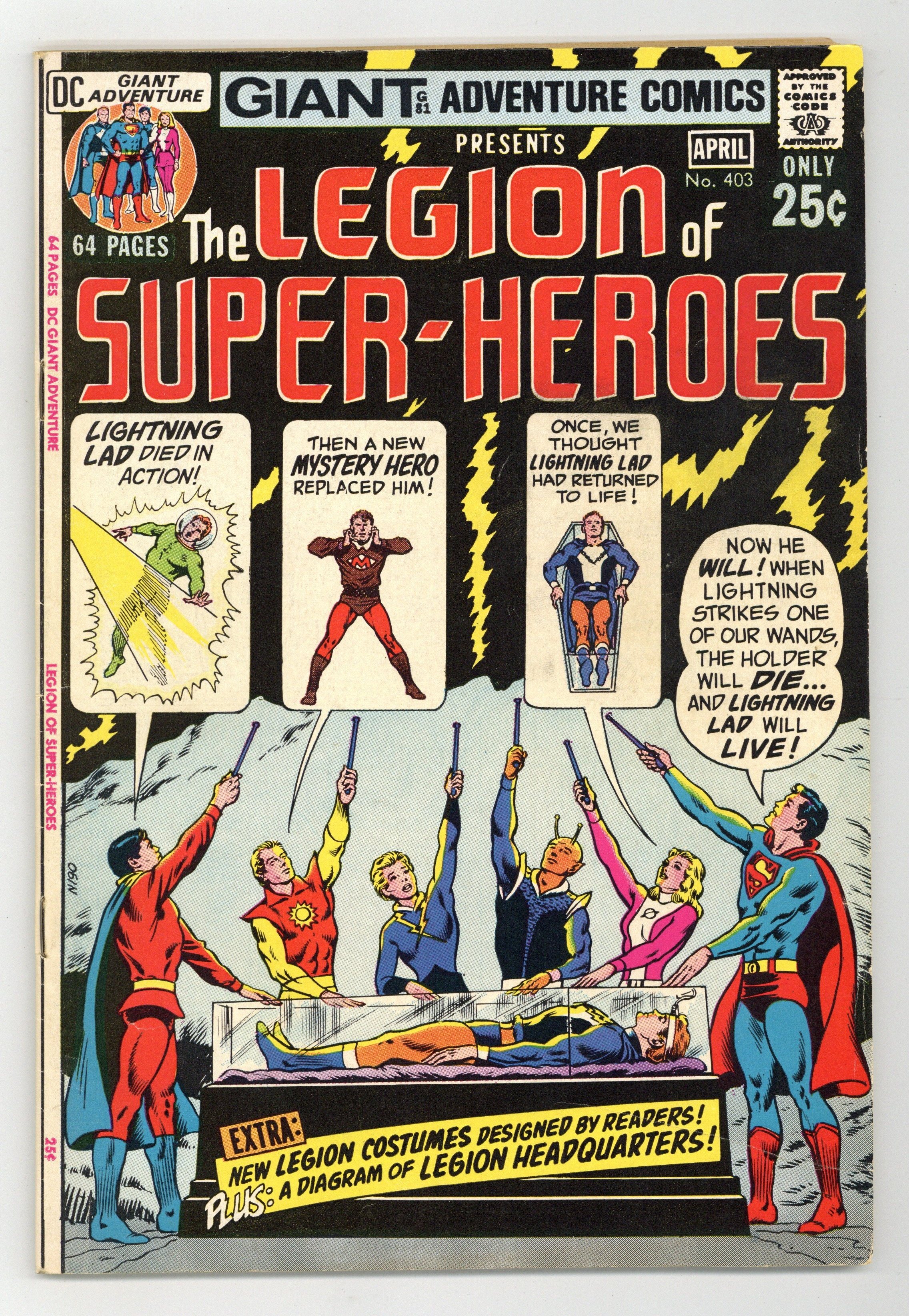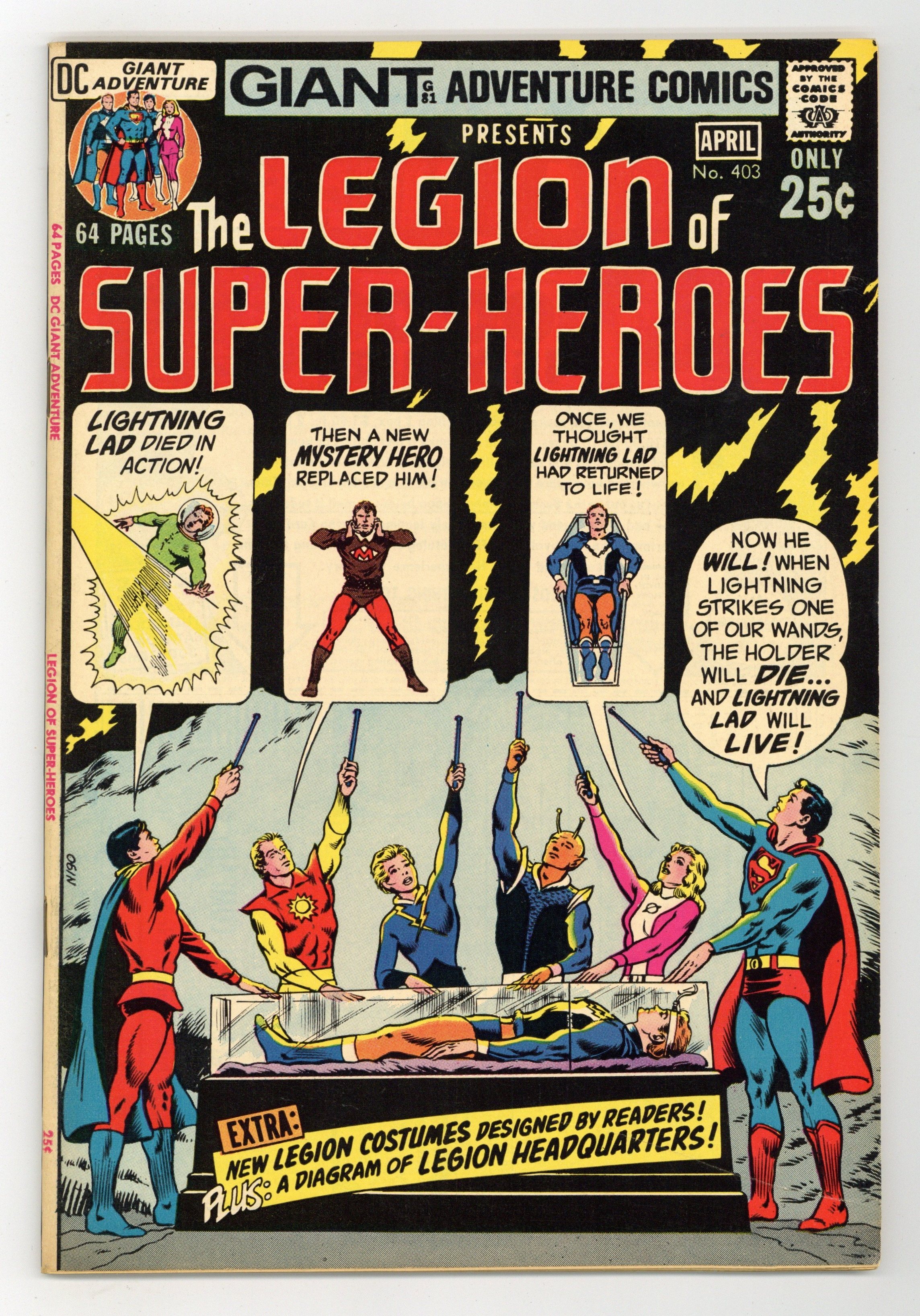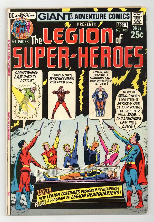68-page Giant G-81; Legion of Super-Heroes reprints. Cover pencils by Curt Swan, inks by Murphy Anderson. The Stolen Super-Powers! (from Adventure 304), script by Jerry Siegel, art by John Forte; Saturn Girl tries to sacrifice herself as the Legionnaire predicted to die fighting Zaryan, but Lightning Lad dies instead. The Secret of the Mystery Legionnaire (from issue 305), script by Jerry Siegel, art by John Forte; Mon-El finally leaves the Phantom Zone and joins the Legion full-time. The Return of Lightning Lad! (from issue 308), script by Edmond Hamilton, art by John Forte. Part I: The Super Sacrifice of the Legionnaires! (from issue 312), script by Edmond Hamilton, art by John Forte. Part II: The Bravest Legionnaire! Special new features: Fashions from Fans presents alternate costumes suggested by fans (pencils by Ross Andru, inks by Mike Esposito) and a two-page Diagram of Legion Headquarters Complex. 68 Pages, Full Color. Cover price $0.25.