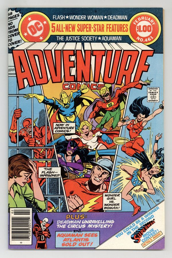 Cover art by Jim Aparo. The Multiple Murders of Mapleville! starring the Flash (Barry Allen), script by Cary Bates, pencils by Irv Novick, inks by Frank McLaughlin. Pursuit! starring Deadman, script by Len Wein, art by Jim Aparo. Only Legends Live Forever starring the Justice Society of America, script by Paul Levitz, art by Joe Staton; Bill Jensen wants to take revenge on Bruce Wayne who put him in prison, even though Wayne had found evidence linking Jensen to several crimes while as a former Gotham City D.A. The Hand That Feeds the Earth... starring Aquaman, script by Paul Kupperberg, pencils by Don Newton, inks by Frank Chiaramonte. School of the Amazoids starring Wonder Woman, script by Jack C. Harris, art by Jack Abel. 68 Pages, Full Color. Cover price $1.00.