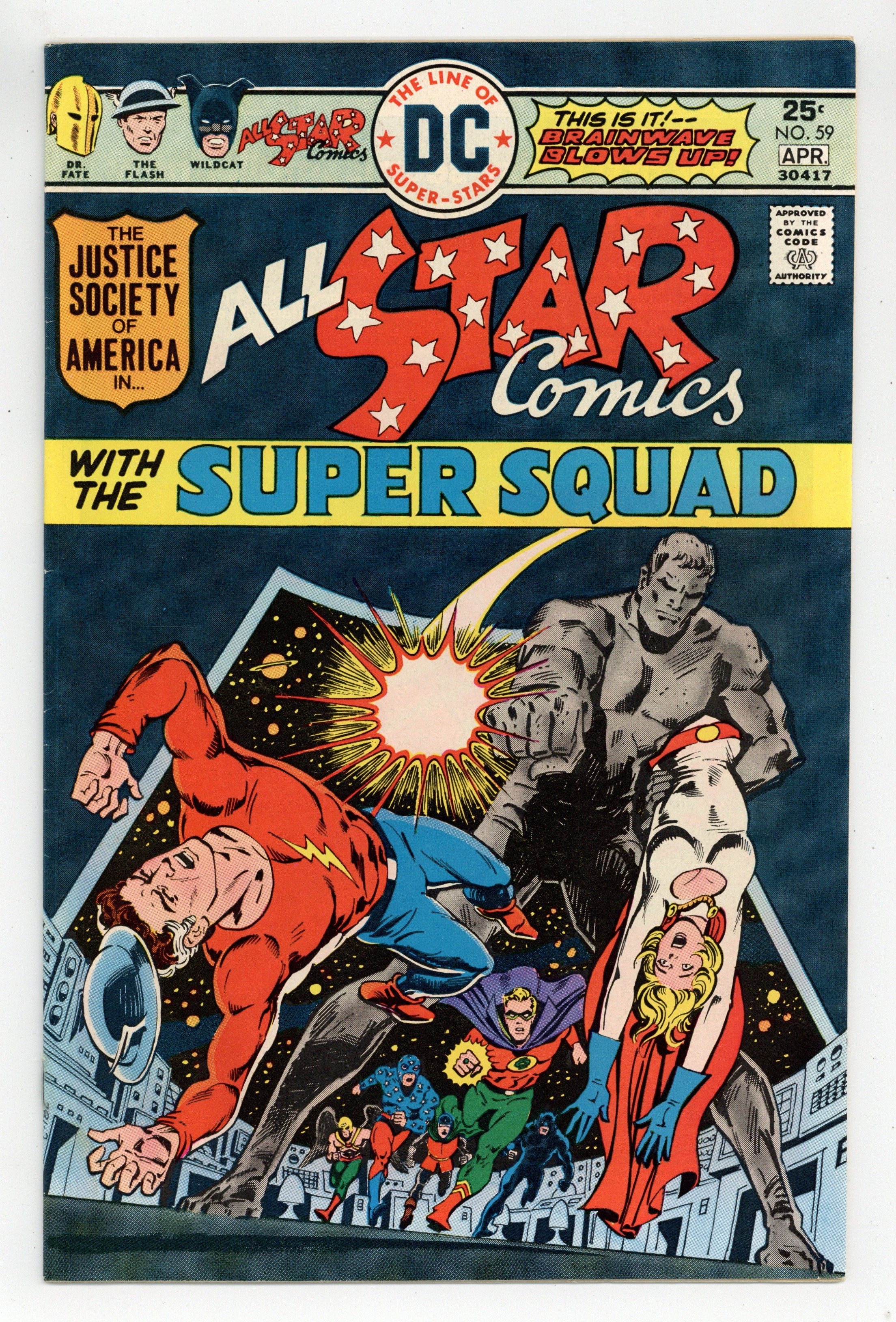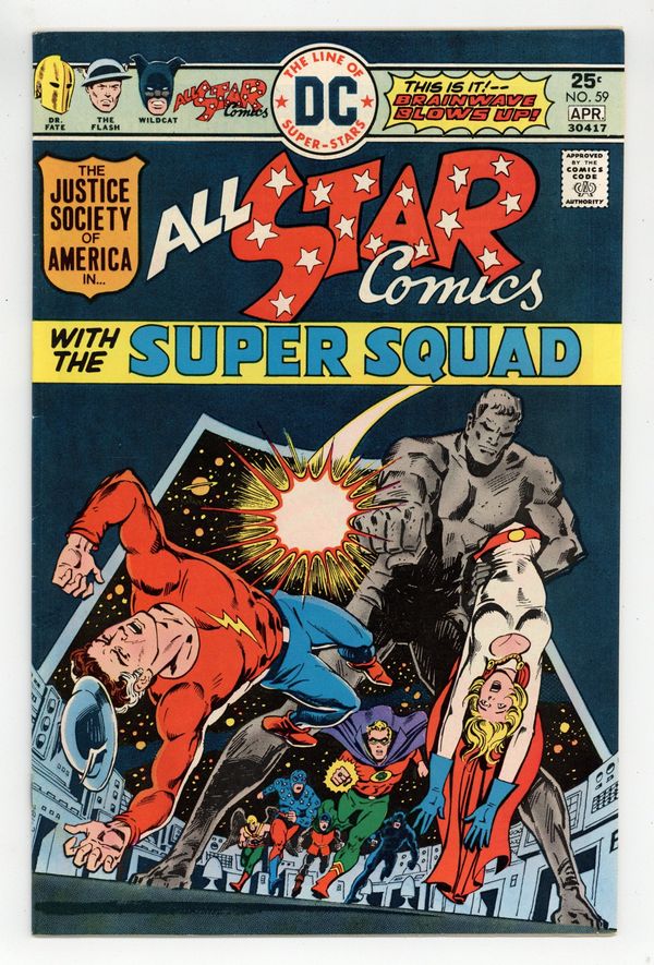 Last 25-cent cover price issue. Cover pencils by Ernie Chan [as Ernie Chua], inks by Jose Luis Garcia-Lopez. Brainwave Blows Up! starring the All Star Super Squad, script by Gerry Conway and Paul Levitz (plot assist), pencils by Ric Estrada (designer) and Wally Wood (artist), inks by Wally Wood; The villain the combined JSA/ Super Squad is facing is none other than one of the JSA's old foes, Brainwave, in a new body; Together, alongside a newly rejuvenated Per Degaton (another old JSA foe), they cause major trouble for our heroes, but the heroes prevail and defeat the two foes as a new menace emerges. The Cup Cake Caper Hostess ad starring Shazam, pencils by Curt Swan, inks by Vince Colletta. Justice for All Includes Children public service announcement starring Superman, art by Neal Adams. 36 Pages, Full Color. Cover price $0.25.