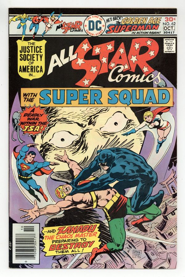 Cover art by Ernie Chan [as Ernie Chua]. When Fall the Mighty starring the All Star Super Squad, script by Gerry Conway (plot) and Paul Levitz (script), pencils by Keith Giffen, inks by Wally Wood; As Dr. Fate lies near death after being injured by Vulcan in the previous issue, Zanadu kidnaps Hawkgirl. Superman (who has come out of retirement to help the JSA/ Super Squad) is entombed alongside his cousin Power Girl by Zanadu; Wildcat suddenly attacks Hawkman after he appears to be hypnotized by strange music as the rest of the team faces off vs. Zanadu elsewhere. Justice for All Includes Children public service announcement starring Superman, pencils by Neal Adams, inks by Vince Colletta. 36 Pages, Full Color. Cover price $0.30.