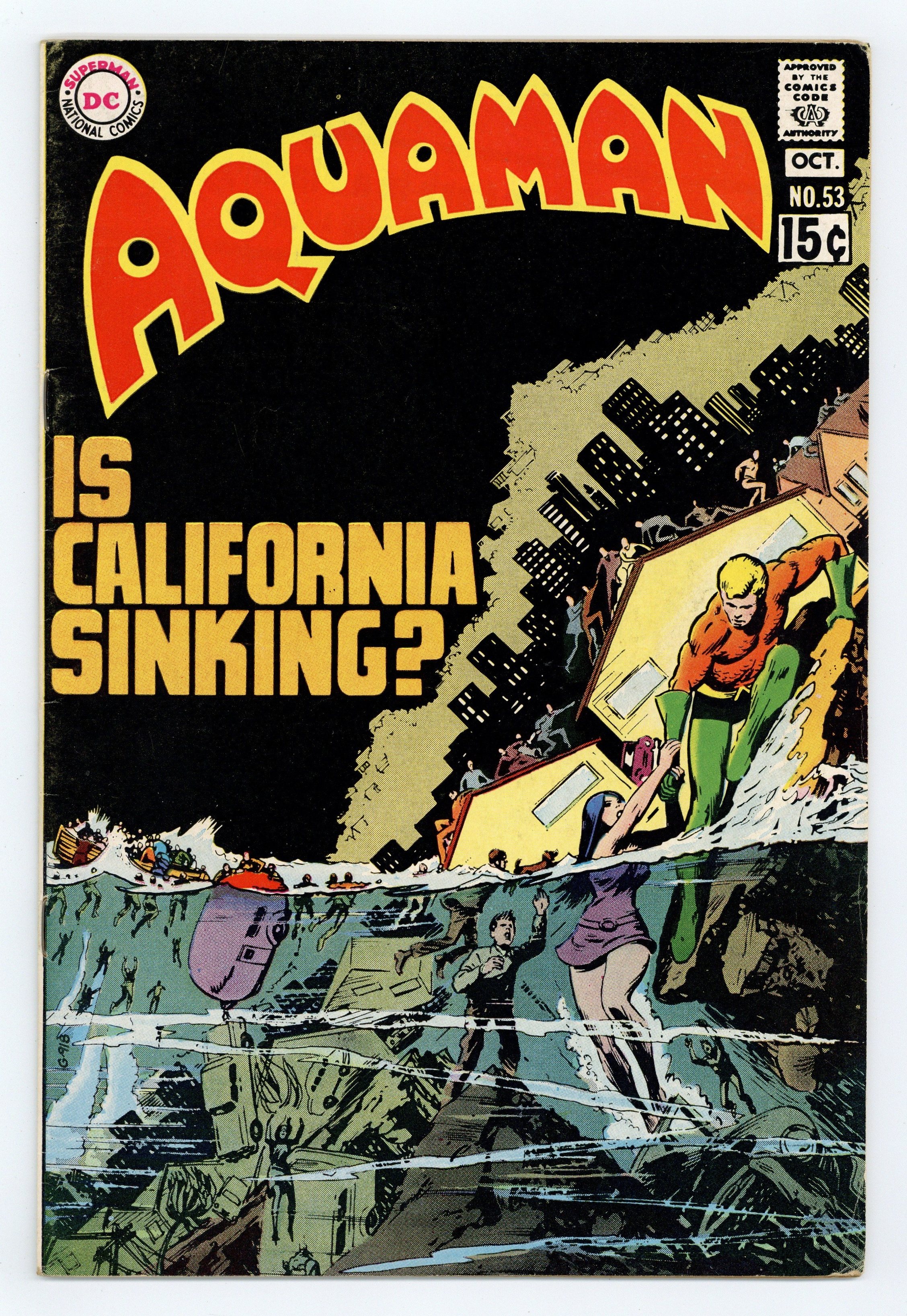 Cover art by Nick Cardy. Is California Sinking?, script by Steve Skeates, art by Jim Aparo; O.G.R.E. agents tell California millionaire Eliot Harlanson that California will sink into the ocean and convince him to buy an atomic bomb for use against Atlantis; Aquaman faces off against Black Manta. 36 pgs. $0.15. Cover price $0.15.