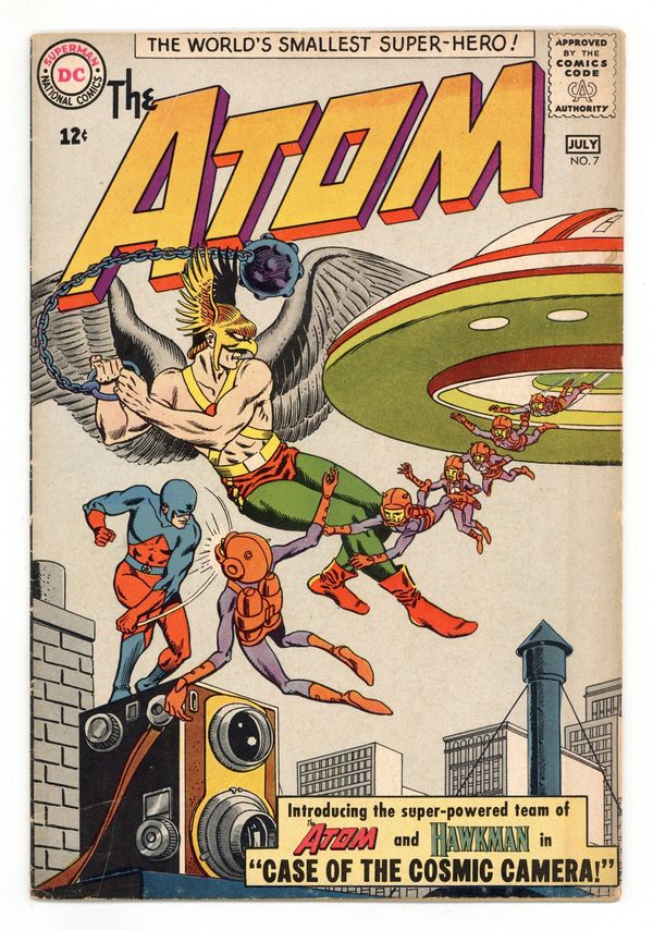 Cover pencils by Gil Kane, inks by Murphy Anderson. 1st Atom and Hawkman team-up (1st appearance of Hawkman since Brave and the Bold tryouts) in "The Case of the Cosmic Camera!", script by Gardner Fox, pencils by Gil Kane, inks by Murphy Anderson; When the Earth is plagued by a series of strange tremors that also effects the migratory patterns of birds, it gains the attention of Ray Palmer and Jean Loring (both avid bird watchers) and Hawkman who is alone following Hawkgirl briefly going to Thanagar to report on their progress on Earth; As Ray stops some crooks who use helium balloons as getaway methods as the Atom, Hawkman determines that the cause of all the trouble is caused by radiation which has been given off by a weapon known by Thanagarian science as a Cosmitron device. 36 pgs., full color. $0.12. Cover price $0.12.