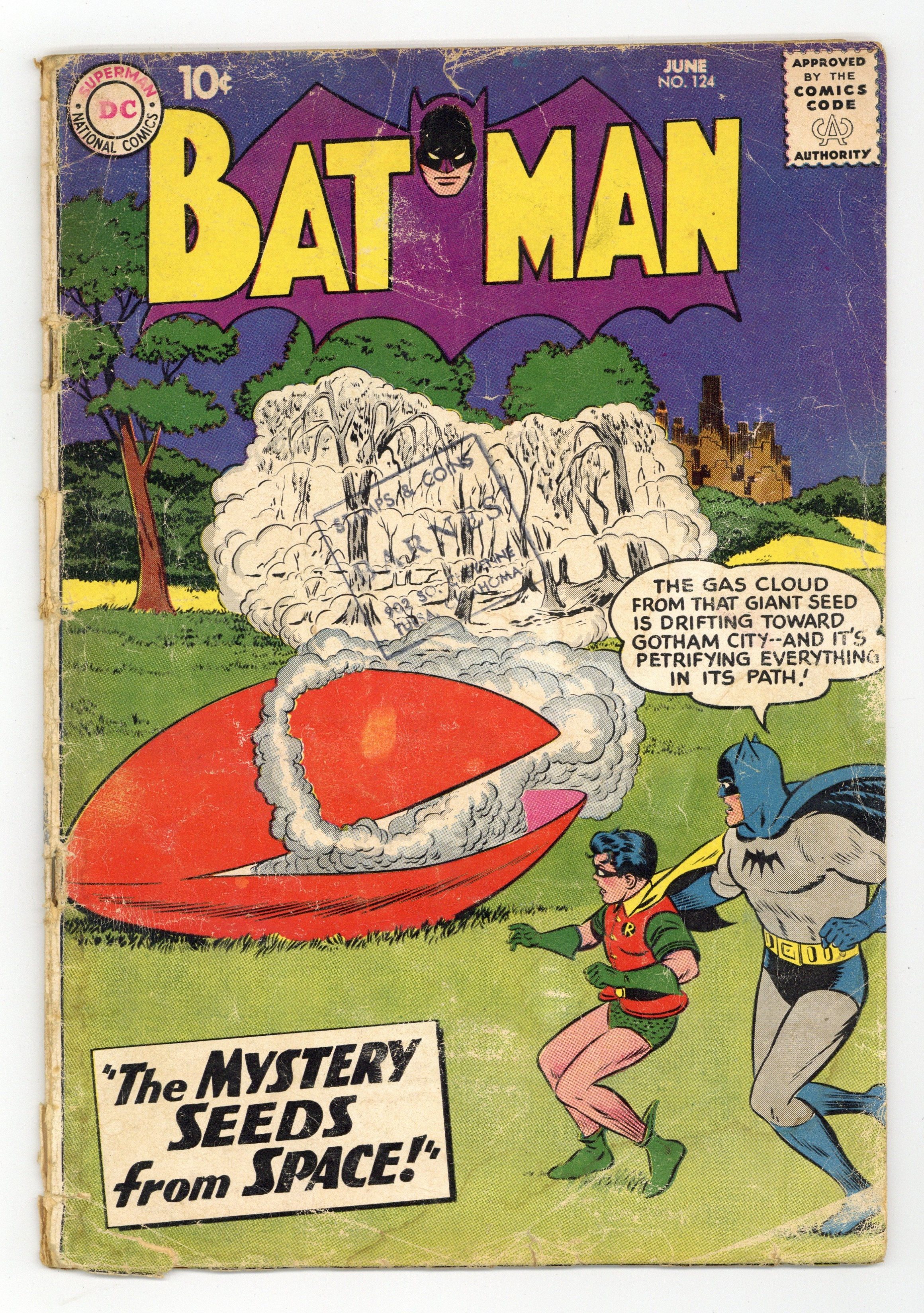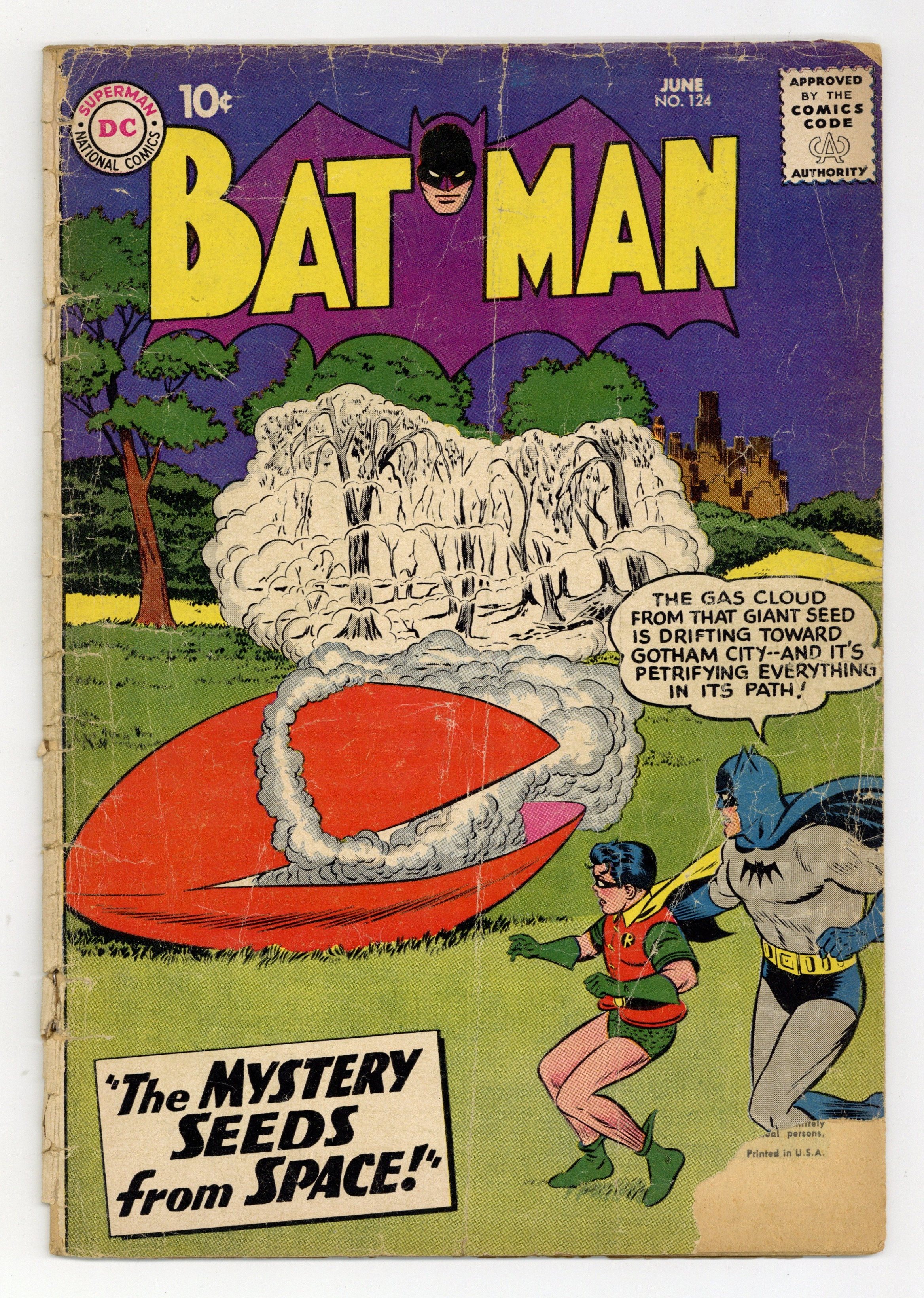 Cover pencils by Curt Swan, inks by Stan Kaye. "The Invisible Batman," script by Bill Finger, pencils by Sheldon Moldoff, inks by Charles Paris; Batman is subjected to an experimental oight that renders him invisible; However, smuggler Smiley Gober finds a way to make the Caped Crusader visible: by throwing flour on him. Fred Finds a Way! public service announcement, script by Jack Schiff, art by Bernard Baily. "The Return of Signalman," script by Bill Finger, pencils by Sheldon Moldoff, inks by Charles Paris; Having escaped from jail, the Signalman attempts to impress his fellow crooks, even in attempting to steal object from a Batman exhibit, but is stopped by the Caped Crusader time and time again. Off-Duty Hero article. One-page Jail Jests story by Henry Boltinoff. "The Mystery Seeds from Space," script by Dave Wood, pencils by Sheldon Moldoff, inks by Charles Paris; Tracking down the source of weird, sonic vibrations, the Caped Crusaders discover the existence of some alien seeds from space, all powered by an alien meteorite, the last of which is a formidable robot. Half-page Casey the Cop story by Henry Boltinoff. 36 Pages, Full Color. Cover price $0.10.