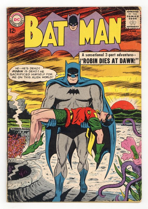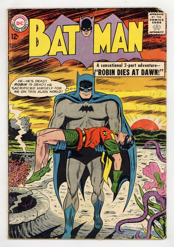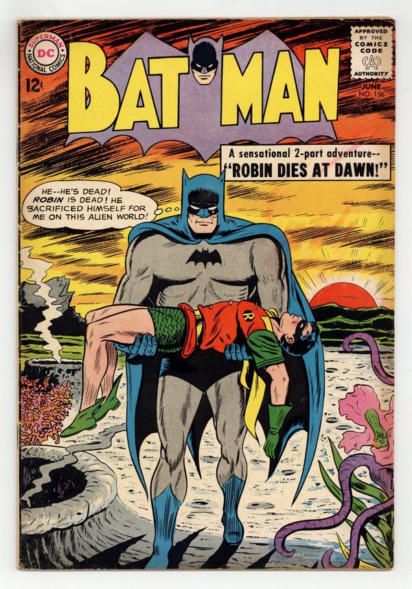 Cover pencils by Sheldon Moldoff, inks by Charles Paris. Not Wanted: High School Dropouts! public service announcement, art by Sheldon Moldoff. "The Secret of the Ant-Man" starring Batman, Robin, Bat-Hound, and Ant-Man, script by Bill Finger, pencils by Sheldon Moldoff, inks by Charles Paris; After Batman announces that he is going away on a secret Government mission, a pint-sized crime fighter by the name of Ant-Man pops up to help him out, but the Boy Wonder wrongly guesses that it is Batman in disguise. True Crime Laffs humor/non-fiction page by Henry Boltinoff. "Robin Dies at Dawn," script by Bill Finger, pencils by Sheldon Moldoff (as Bob Kane), inks by Charles Paris; Batman undergoes a test simulation for a situation that astronauts may one day face alone in outer space, and during that simulation he sees Robin dies; After the test is over, Batman faces the terrible side-effects of his simulation, believing that Robin will actually die, and it so complicates his fight against crime, he decides to retire! 36 Pages, Full Color. Cover price $0.12.