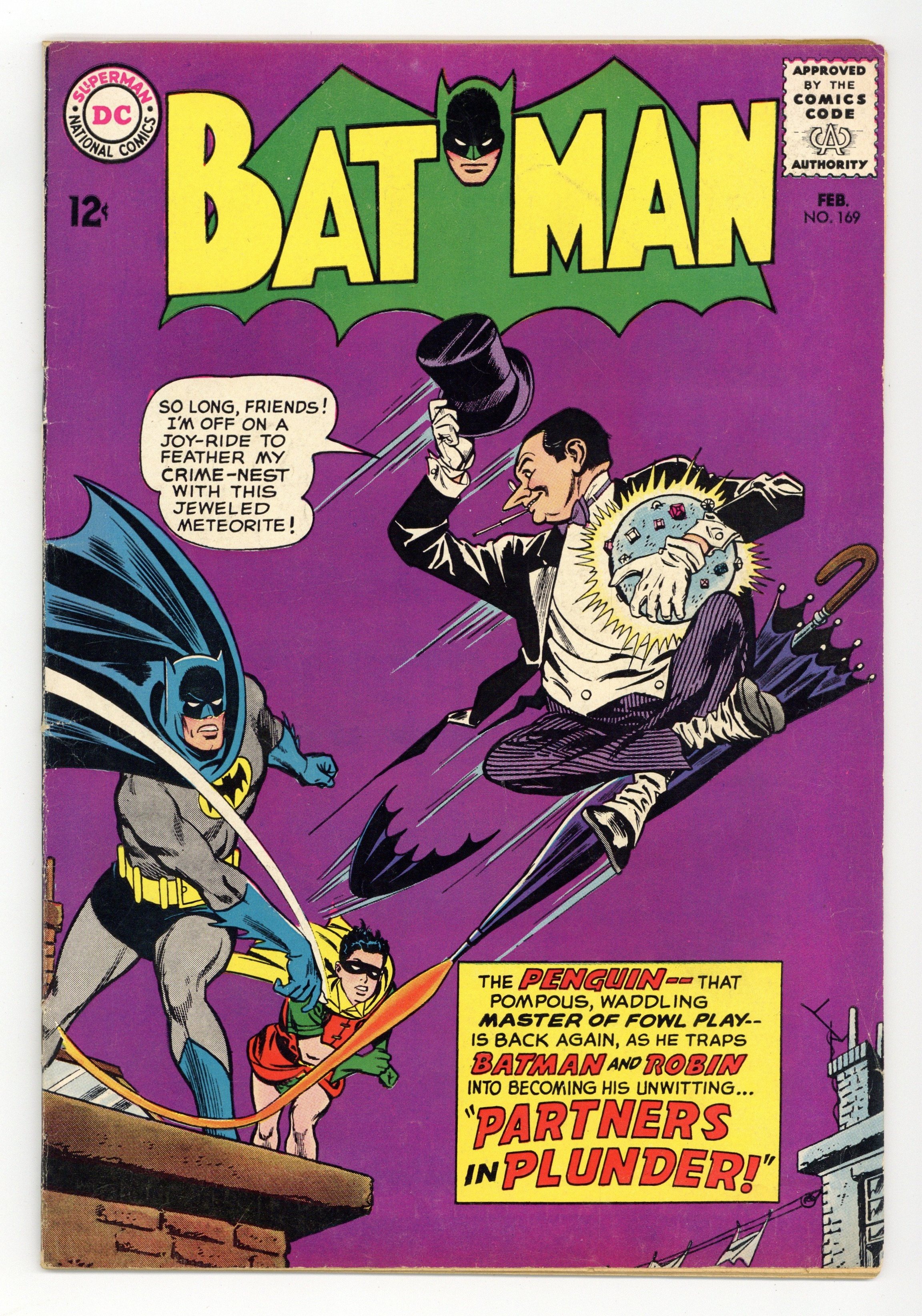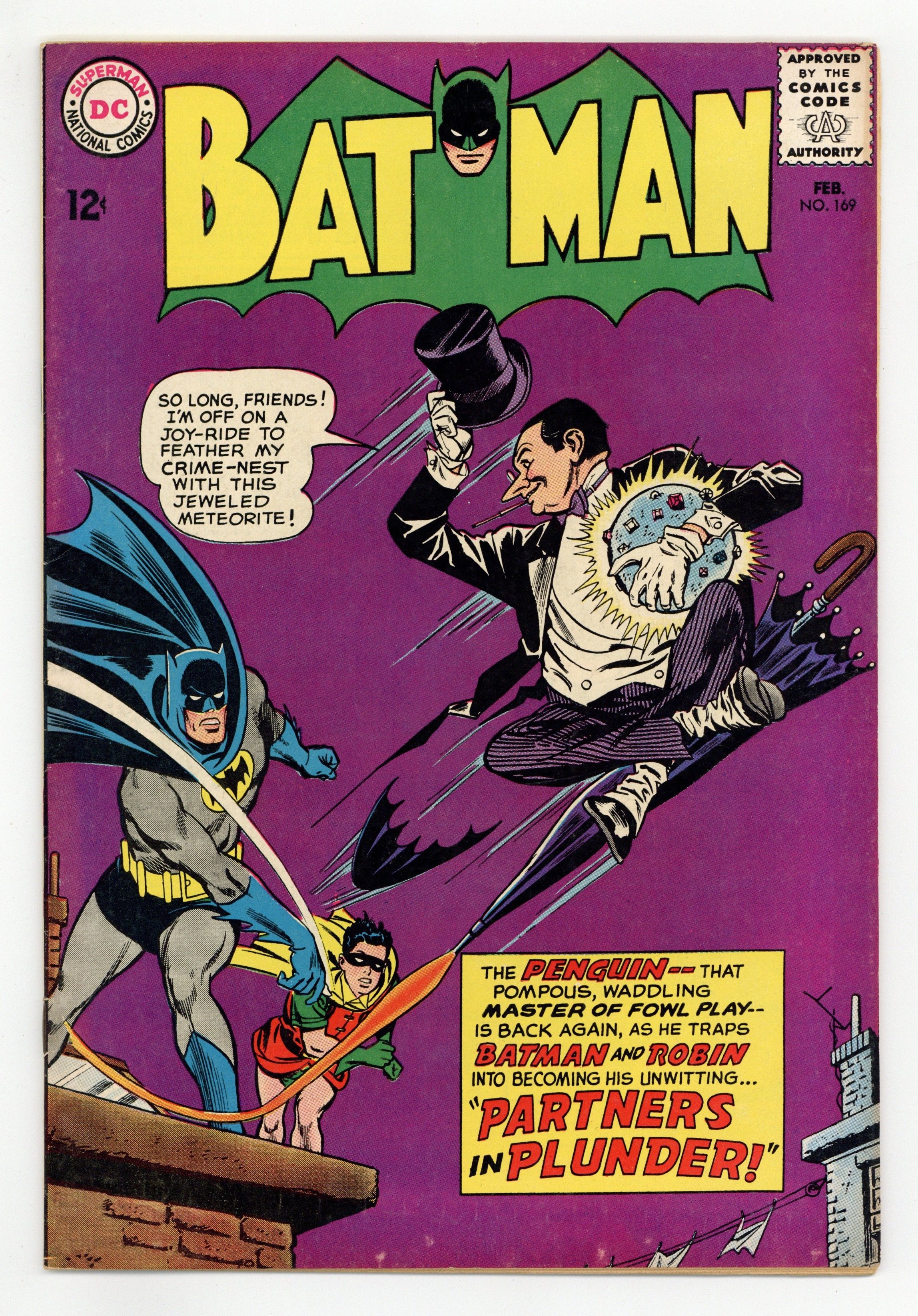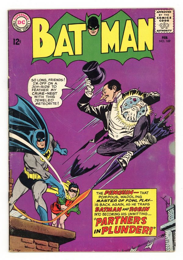 Cover pencils by Carmine Infantino, inks by Joe Giella. Don't Give Fire a Place to Start! public service announcement, script by Jack Schiff, art by Win Mortimer. "Partners in Plunder!", script by France Herron, pencils by Sheldon Moldoff (as Bob Kane), inks by Joe Giella; The Penguin uses an umbrella barrage to trick Batman into planning his next crime for him. "A Bad Day for Batman!", script by France Herron, pencils by Sheldon Moldoff (as Bob Kane), inks by Sid Greene; Batman tells the press about his bad day, in which he returns to the scene of a previous case to retrieve some rope, and spots a jewel thief; He pursues, but a series of bad breaks allows the felon to escape. Fingerprint Facts non-fiction page, script by Julius Schwartz, pencils by Morris Waldinger, inks by Tom Nicolosi. Letter to the editor from comics writer Mike Friedrich. 36 Pages, Full Color. Cover price $0.12.