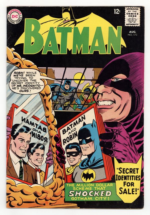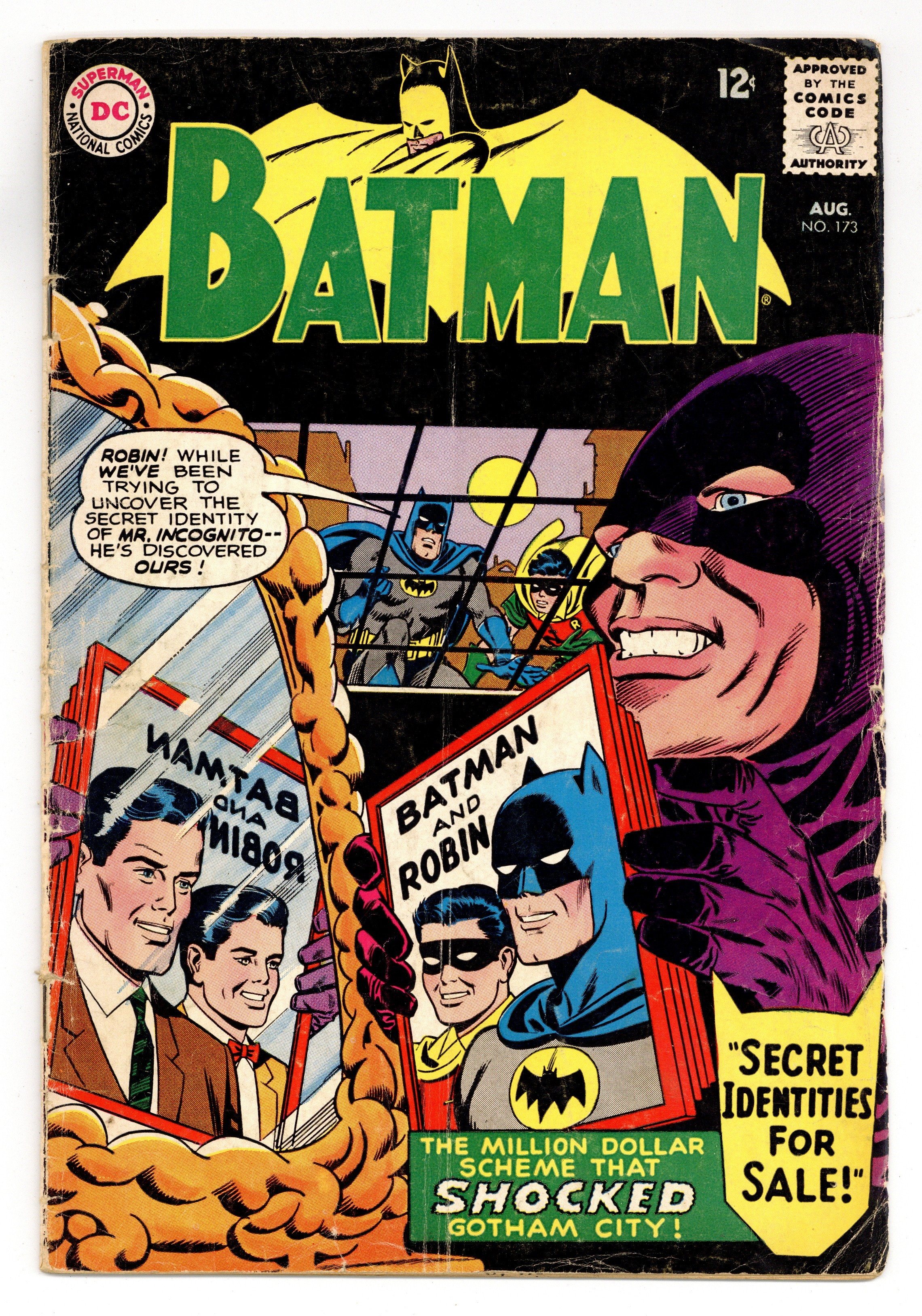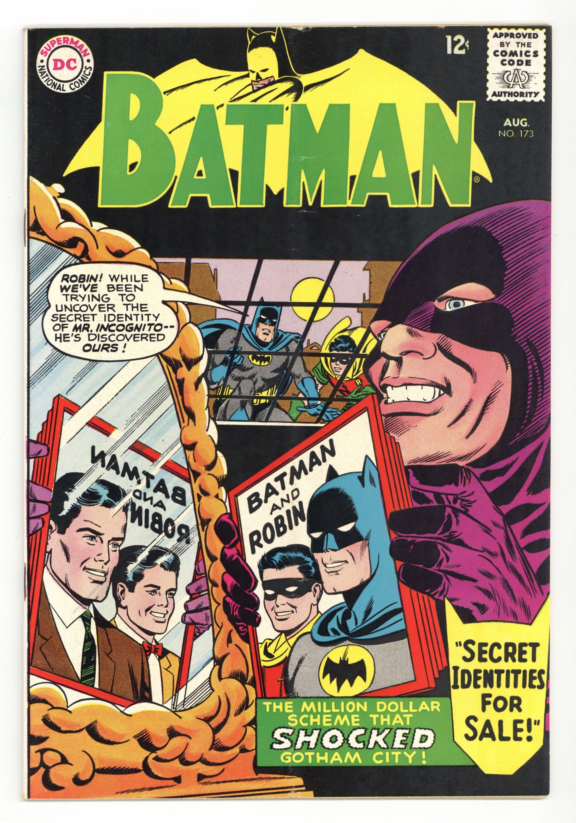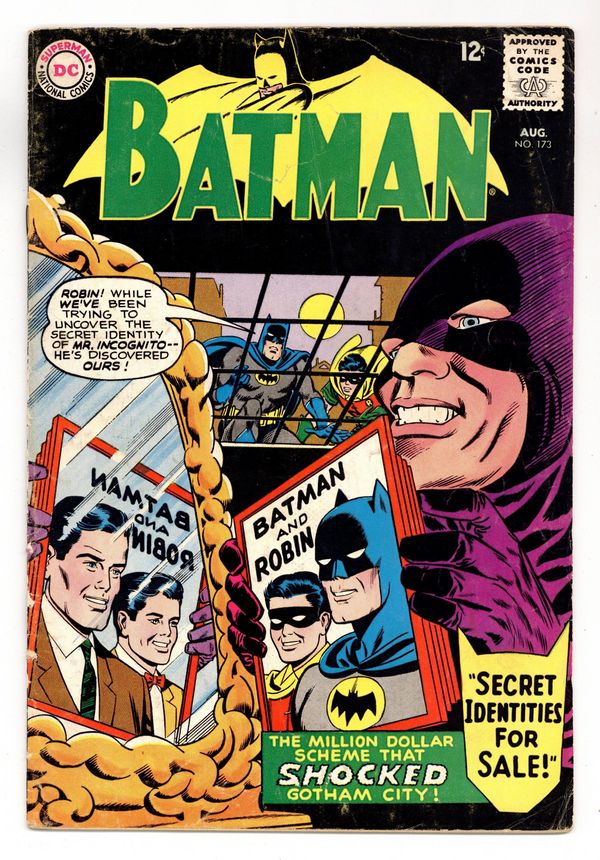 Cover pencils by Carmine Infantino, inks by Joe Giella. "Secret Identities for Sale!", script by John Broome, pencils by Sheldon Moldoff, inks by Joe Giella; While the Caped Crusaders are raiding the hideout of Mr. Incognito, a photographer takes pictures of the action with a special x-ray film, revealing the criminal's identity; The man offers to provide the identity to the Police for a million dollars while also offering the secret identities of the Dynamic Duo to the underworld for a price. "Walk, Batman--To Your Doom!", script by John Broome, pencils by Sheldon Moldoff (as Bob Kane), inks by Sid Greene; Batman is asked to investigate when four air-tight cases are blown when the juries involved return "not guilty" verdicts; Batman soon discovers that one juror, Franklin Knott, has been on all four juries in disguise. Rocky and Bullwinkle star in a one-page Cheerios ad. 36 Pages, Full Color. Cover price $0.12.