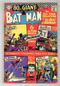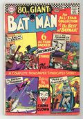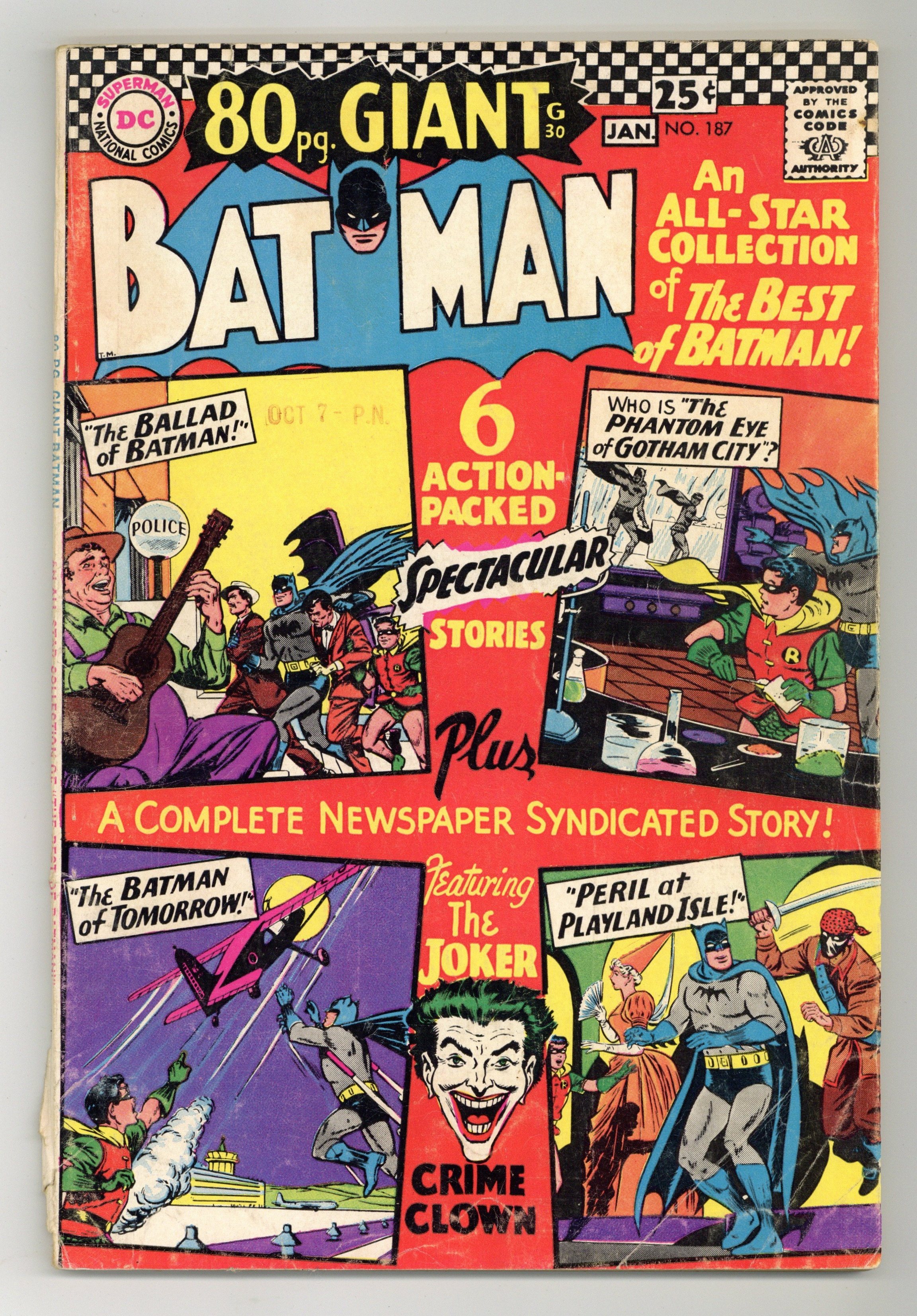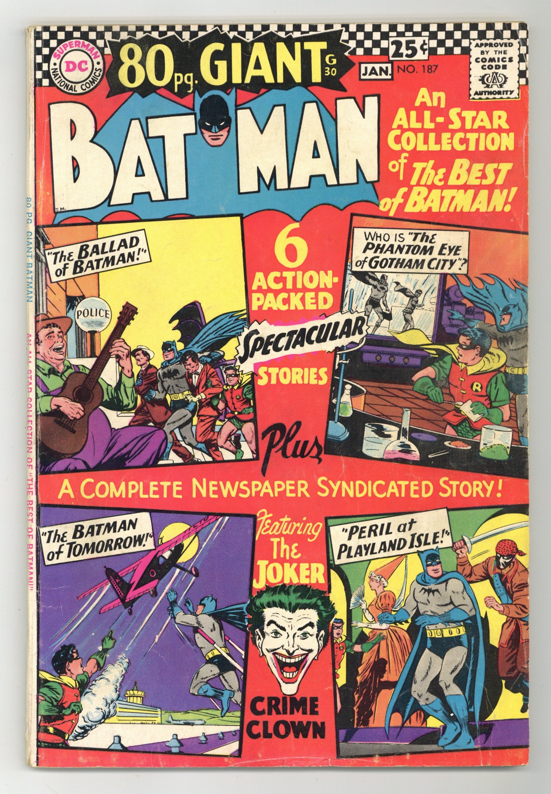 Reprints, 80-page giant. Cover pencils by Win Mortimer and Curt Swan, inks by Win Mortimer and Stan Kaye. "Batman's First Case" (from Detective # 265), script by Bill Finger, pencils by Sheldon Moldoff, inks by Charles Paris; The sudden appearance of a new criminal basing his crime on time jogs Batman's memory into remembering that this criminal was his very first case after his parents were killed, and if the Clock has his way, the current case against him will be the Caped Crusader's last! "Phantom Eye of Gotham City" (from Detective 192), pencils by Bob Kane, inks by Charles Paris; As vicious criminal creates a means to televise crimes as they happen and making the Dynamic Duo look like they are inept. "The Last Days of Batman" (from Batman 125), script by Bill Finger, pencils by Sheldon Moldoff, inks by Charles Paris; Carter Nichols sends the Dynamic Duo back to ancient Venice to gather evidence in a case, but only Batman returns, while Robin is shifted to Gotham City a few days into the future, where he discovers a new criminal will kill Batman. "Peril at Playland Isle" (from Detective 264), script by Bill Finger, pencils by Dick Sprang, inks by Charles Paris; When the wealthy builder of a new amusement park is killed, Batman and Robin nearly lose their lives tracking down the real killer. "The Batman of Tomorrow" (from Detective 216), script by Edmond Hamilton, pencils by Dick Sprang, inks by Charles Paris; When Bruce Wayne injures his arm, to keep Vicki from discovering that Batman has the same problem, the Caped Crusader seeks out the Batman of the Future to step in for him...almost with disastrous results! "The Ballad of Batman!" (from Batman 95), script by Edmond Hamilton, pencils by Dick Sprang, inks by Charles Paris; A balladeer comes to Gotham City to sing the praises of Batman in verse, but it backfires when his songs tip off crooks wanting to commit crimes. Cap's Hobby Hints activity half-page by Henry Boltinoff. A complete Batman newspaper syndicated story reprint featuring the Joker (7 pages) from Oct.-Dec. 1946. 84 Pages, Full Color. Cover price $0.25.