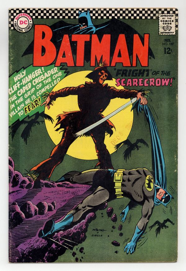 Starts Dec 15 Cover pencils by Carmine Infantino, inks by Joe Giella. 1st Silver Age appearance of Scarecrow in book-length story, "Fright of the Scarecrow!", script by Gardner Fox, pencils by Sheldon Moldoff (as Bob Kane), inks by Joe Giella; While entertaining some children in the park, Dick happens to notice the Scarecrow retrieving buried loot from a past robbery; He calls in Batman and together they battle their old foe until they are blinded by Scarecrow's fear gas. Little Pete humor half-page by Henry Boltinoff. Letter from comic book writer Mark Evanier. Peace on Earth public service announcement. Eyes Front! humor half-page by Henry Boltinoff. 36 Pages, Full Color. Cover price $0.12.