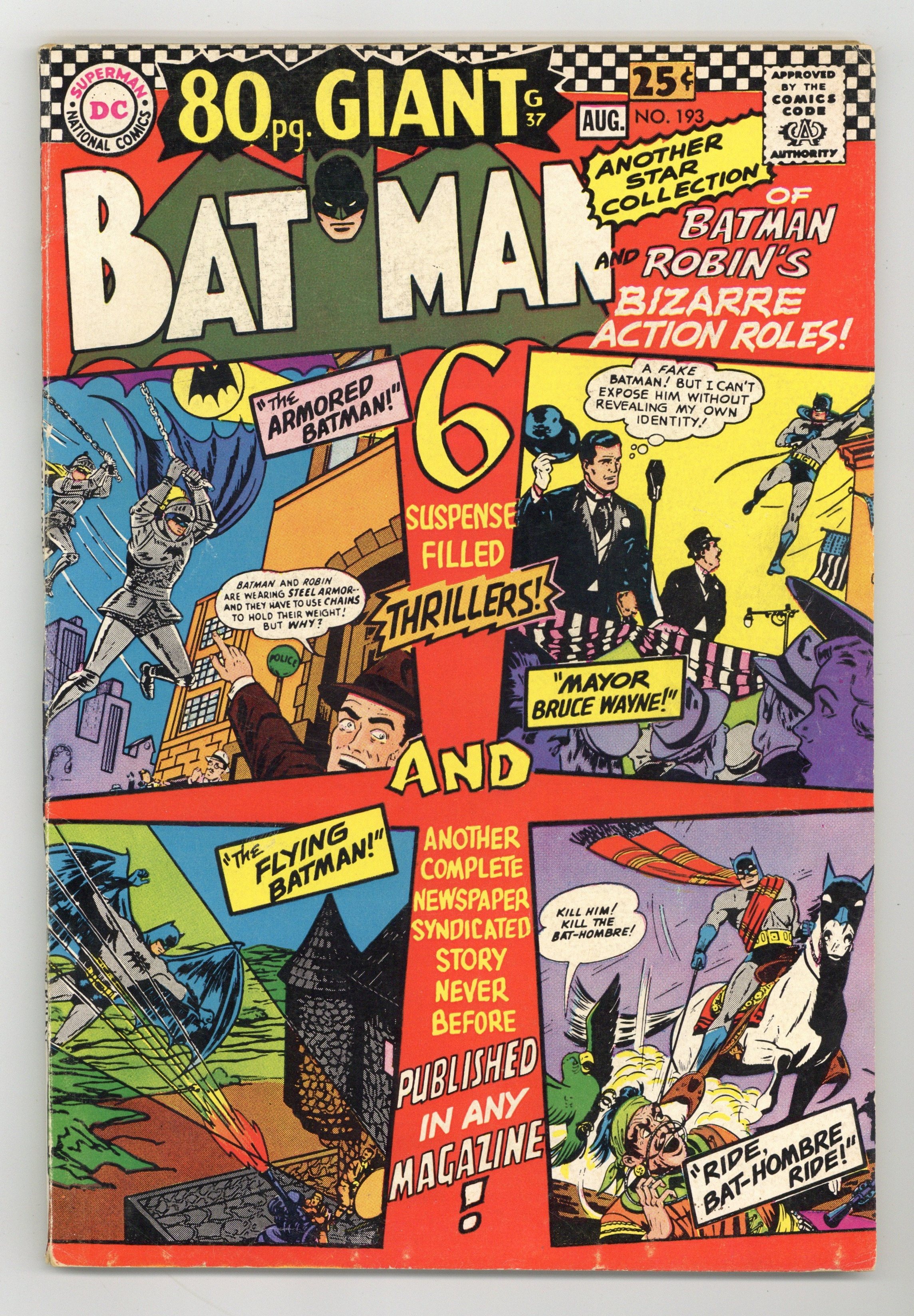 Starts Dec 22 Cover pencils by Dick Sprang, Win Mortimer, Sheldon Moldoff, inks by Charles Paris, Win Mortimer, and Sheldon Moldoff. "Ride, Bat-Hombre, Ride!", script by David Vern, pencils by Dick Sprang, inks by Charles Paris; The sickly Presidente of a Latin American nation implores the Caped Crusaders to come to his nation and train a Batman to keep law and order in his country. "The Armored Batman," script by Edmond Hamilton, pencils by Sheldon Moldoff, inks by Stan Kaye; All of Gotham City is puzzled by Batman and Robin's odd behavior and strange costuming when they hear of a man named Blair Graeme threatening the Caped Crusaders. "His Majesty, King Batman," script by Bill Finger, pencils by Sheldon Moldoff, inks by Charles Paris; A visiting royal dignitary visiting Gotham City gets an unexpected role he never expected: to play the role of Batman while the real Caped Crusader looks for a wanted felon. Make Your Summer Count! public service announcement, art by Sheldon Moldoff. "Batman and the Vikings!", pencils by Bob Kane, inks by Charles Paris; When Bruce and Dick visit the Gotham City museum, they note an image of a Viking that looks like Bruce Wayne...and who is labeled a coward, so they visit Carter Nichols to go back in time to discover the truth. "Mayor Bruce Wayne!", script by David Vern, pencils by Dick Sprang, inks by Charles Paris; Racketeer Deuce Chalmers has figured out that Bruce Wayne is Batman...the trouble is, how does he prove it?; And Bruce has troubles as well with his secret identity since he has been appointed temporary Mayor. "The Flying Batman", script by David Vern, pencils by Sheldon Moldoff, inks by Stan Kaye; Batman and Robin are rendered unconscious by a sting from a strange winged man, only to awake in a weird city inhabited by winged men, who want to operate on Batman to give him wings in order to track down desperate felons.. A complete Sunday newspaper syndicated story reprinted, script by Bill Finger, pencils by Jack Burnley, inks by Charles Paris. 84 Pages, Full Color. Cover price $0.25.