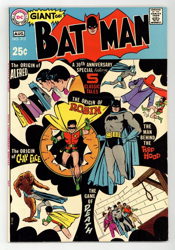 Tags: Giant-Sized Issue$85.00DC Giant G-61; 30th anniversary issue. "The Origin of Robin" (new story; script by E. Nelson Bridwell, pencils by Ross Andru, inks by Mike Esposito) "Here Comes Alfred," the original origin of Alfred, from Batman no. 16 (April-May, 1943). "The Game of Death," from Star Spangled Comics no. 127 (April, 1952). "The Man Behind the Red Hood," one of the most important stories in the Batman mythos, from Detective no. 168 (February,1951). "The Challenge of Clay-Face," the origin of the second Clay-face, from Detective no. 298 (December, 1961). 68 Pages, Full Color. Cover price $0.25.