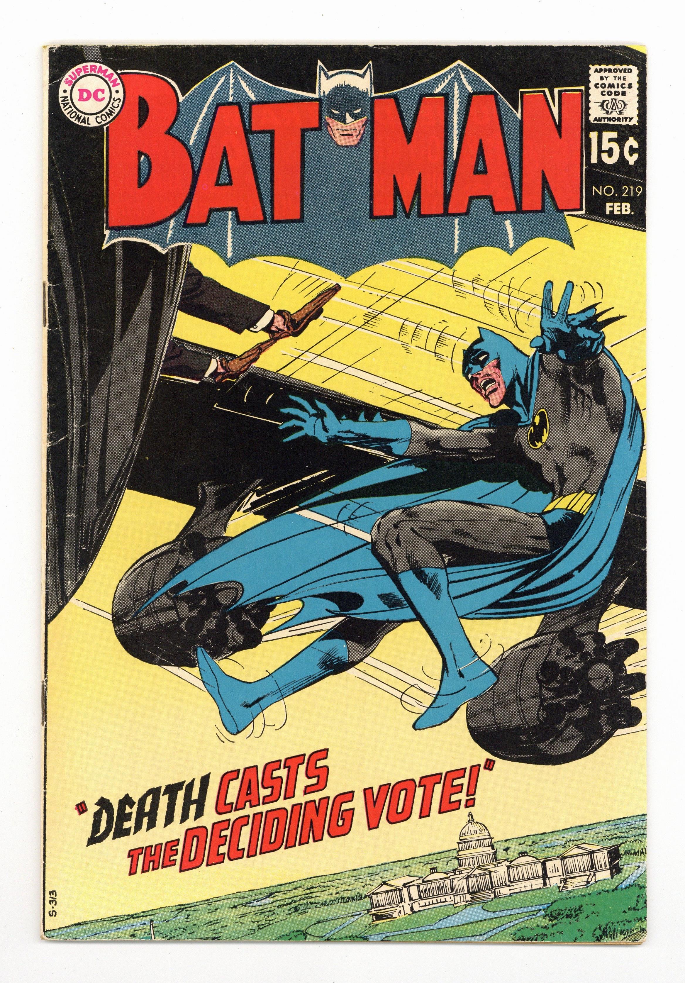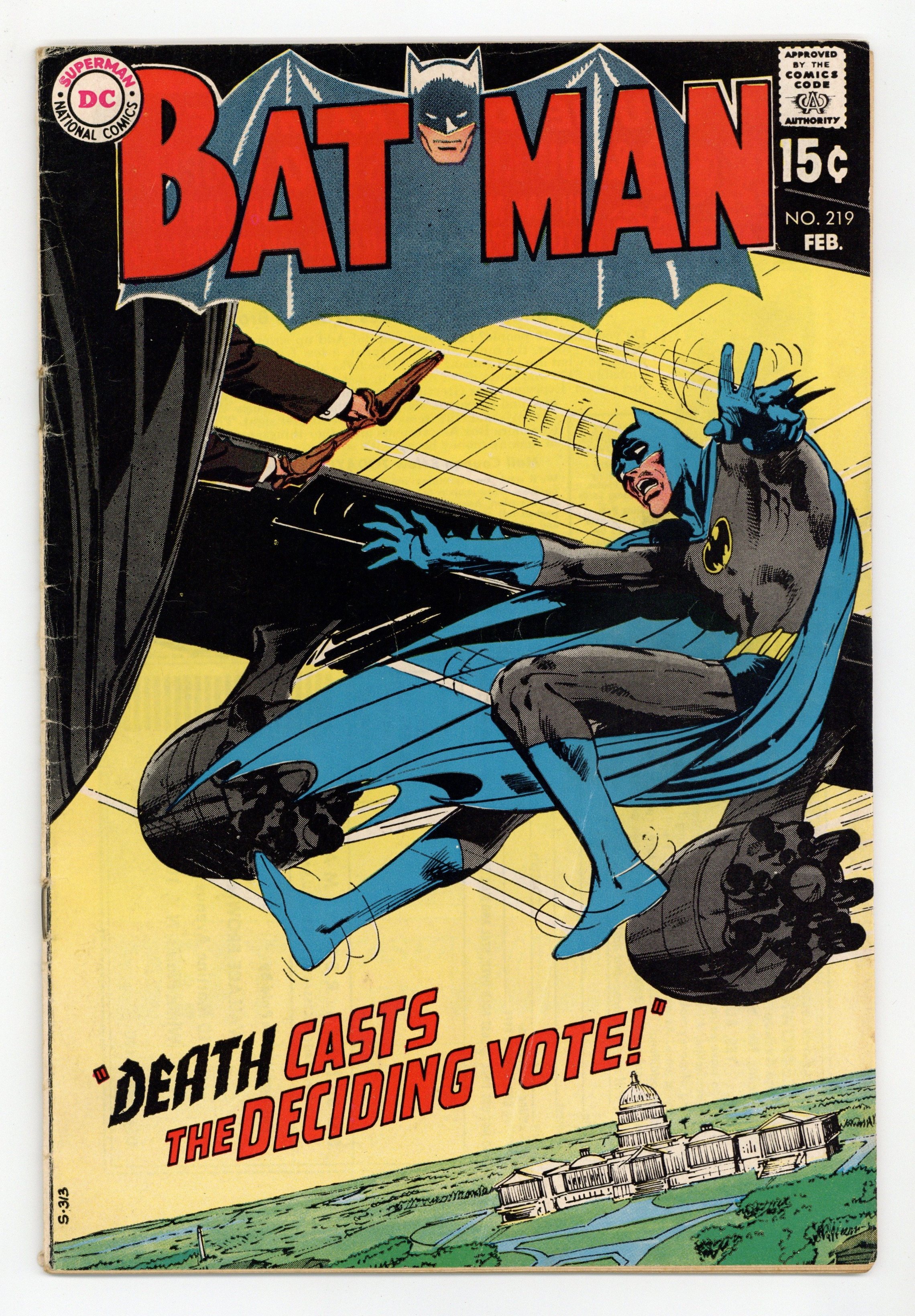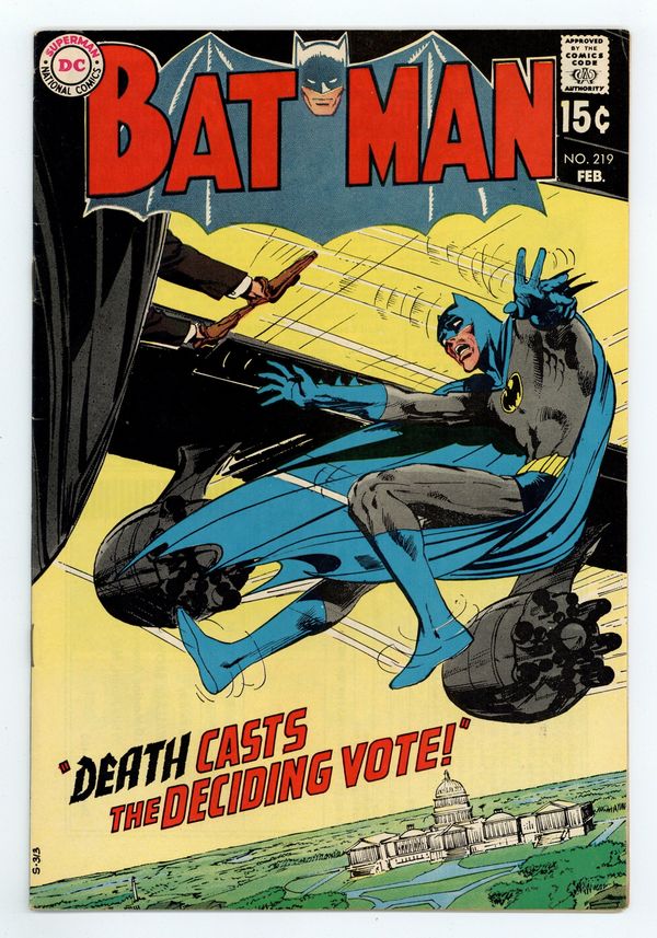 Tags: Batman$23.00Cover by Neal Adams. "Death Casts the Deciding Vote," script by Frank Robbins, pencils by Irv Novick, inks by Dick Giordano; Batman stops an airplane hijacking and gets a senator to Washington DC in time for a critical vote on an anti-crime bill. "The Silent Night of the Batman," script by Mike Friedrich, pencils by Neal Adams, inks by Dick Giordano; A peaceful night in Gotham allows Batman to spend time with James Gordon. Reprint fantasy story: "Time to Kill!", script by Jack Miller, art by John Giunta; Jed Bruno travels to the future to get revenge on his enemy. Letter to the editor from inker Klaus Janson. 36 Pages, Full Color. Cover price $0.15.