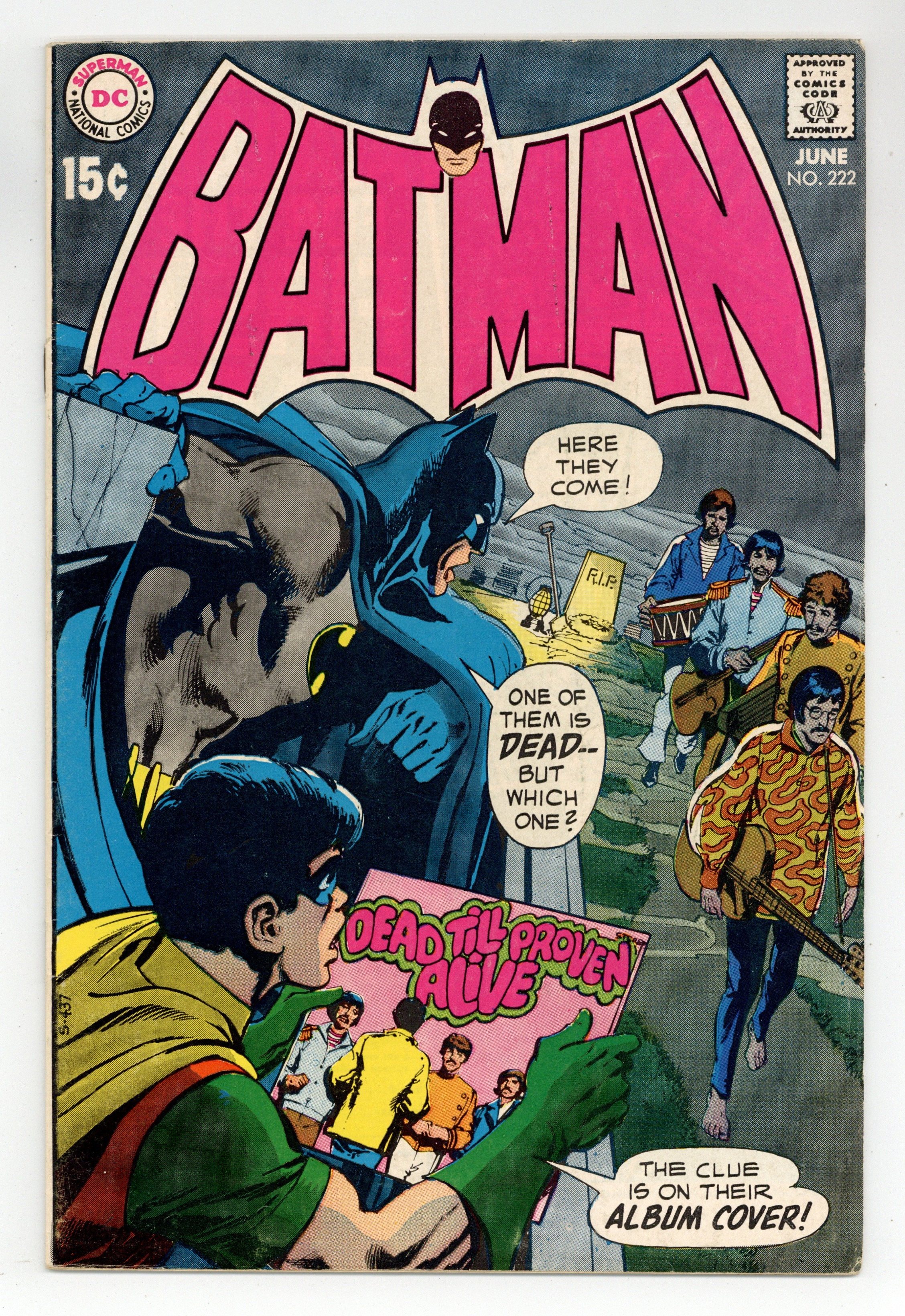 Cover art by Neal Adams. "Dead... Till Proven Alive!", script by Frank Robbins, pencils by Irv Novick, inks by Dick Giordano; Rock fans worldwide are finding clues buried in Oliver Twists albums that the lead singer, Saul Cartwright, is dead and has been replaced by an impostor; Batman and Robin investigate the matter while the rockers are guests at Wayne Manor and find criminal ties to one member; During their investigations, the Dynamic Duo come across a couple of deadly traps and they realize that one of the members of the group has tried to kill them. "So You Want to be a Cartoonist?" article by Joe Kubert. "Case of No Consequence!", script by Mike Friedrich, pencils by Irv Novick, inks by Dick Giordano; After a long night of fighting crime, Batman is exhausted, but as he is ready to return home, he spots a mugger taking away something from a man; When Batman approaches, he learns that the victim was mute and could only speak in hand signs; The man tells Batman that the thief took away his camera, which is his only means of livelihood; Batman decides to fulfill the mute photographer's request to retrieve his stolen camera and he starts a chase across the city. Letters to the editor from comic writer Mike Barr, comic artist John Workman, and comics historian Bill Schelly. Beatles cover appearance. 36 Pages, Full Color. Cover price $0.15.