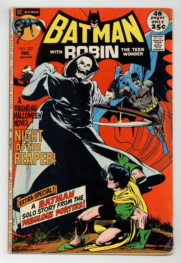 Cover by Neal Adams. "Night of the Reaper!", script by Denny O'Neil, pencils by Neal Adams inks by Dick Giordano; Dick Grayson attends the annual Vermont parade on Halloween with some of his college friends; The notice some crooks attacking a man dressed as Robin and try to help him; The Reaper attacks Robin; Batman, who has been tracking an ex-Nazi war criminal to the parade, finds Robin and takes him to the house of Tom Fagan, the parade organizer. A letter from Denny O'Neil who recounts the real life events that inspired "Night of the Reaper." "The Screaming House," script by Bill Finger, pencils by Bob Kane and Jerry Robinson (backgrounds), inks by Bob Kane; While passing by an old house, the Batman hears screams and rushes in to save a man, who he soon discovers is a crook that has been double crossing his boss and who kills the thugs torturing him so there will be no witnesses; Later, the Caped Crusader learns from the dying Joey that his boss is a big time smuggler. 52 Pages, Full Color. Cover price $0.25.