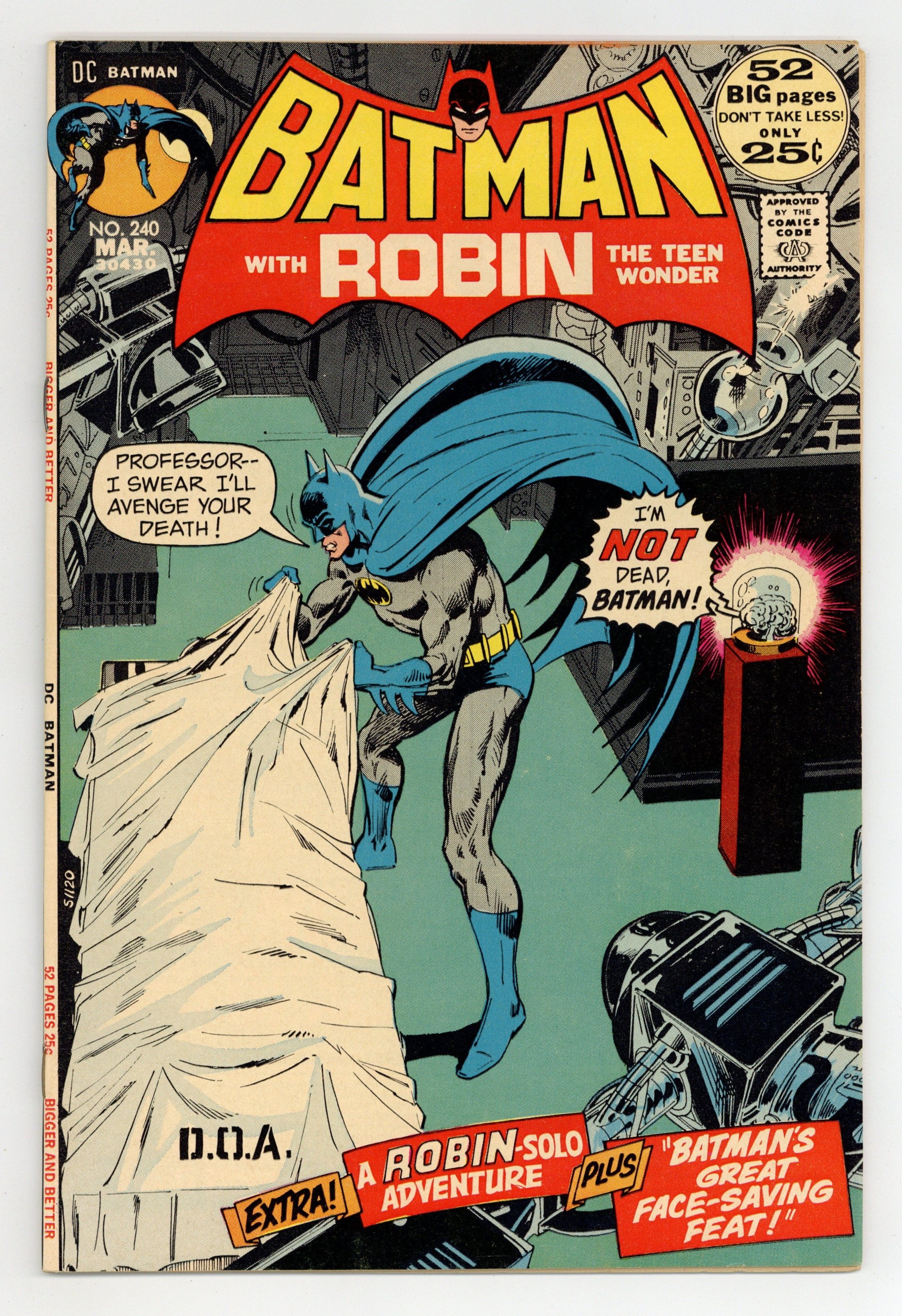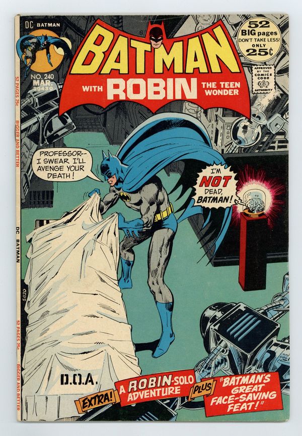 52-page giant. Cover pencils by Neal Adams, inks by Dick Giordano. "Vengeance for a Dead Man!", script by Denny O'Neil, pencils by Irv Novick, inks by Dick Giordano; Batman and Talia track down the killer of Mason Sterling and Batman discovers who removed Sterling's brain. "Theater of the Mind!", script by Mike Friedrich, art by Rich Buckler; Robin reunites Rick Asher with his father. "Batman's Great Face-Saving Feat!", script by France Herron, pencils by Sheldon Moldoff (ghost for Bob Kane), inks by Joe Giella; A private investigator seeks to join the Mystery Analysts, but is blackballed by Batman for a very specific reason. Letter to the editor from writer and DC "Answer Man" Bob Rozakis. 52 Pages, Full Color. Cover price $0.25.