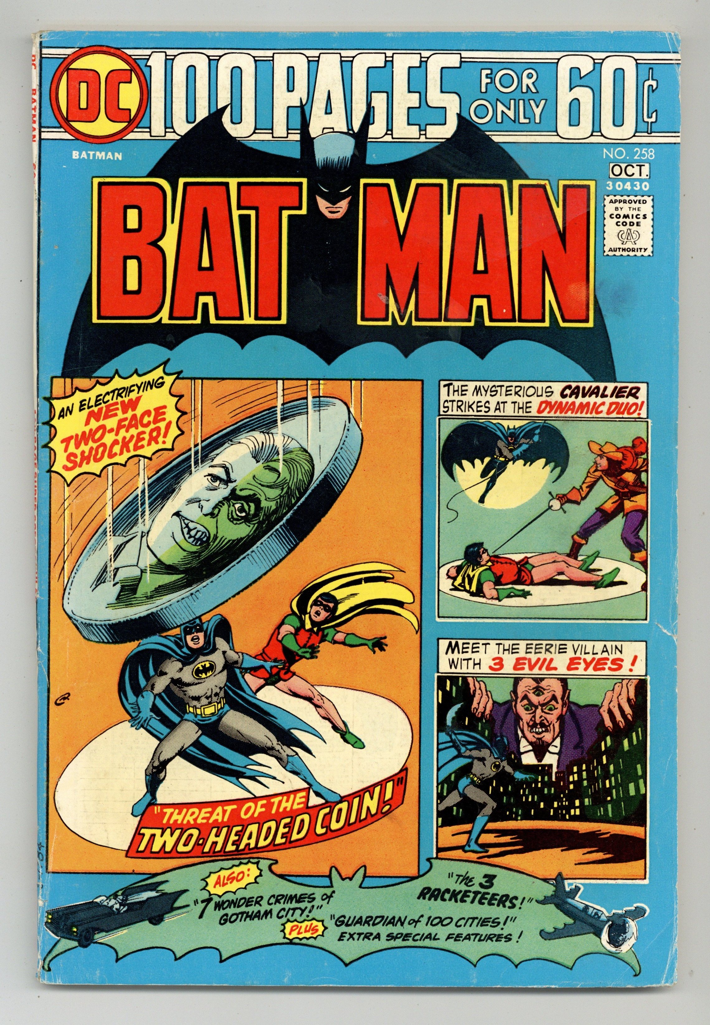 100-page giant. Cover by Nick Cardy. Two-Face is back in a new story, "Threat of the Two-Headed Coin!", script by Denny O'Neil, pencils by Irv Novick, inks by Dick Giordano; Two-Face returns, having devised a plan to extort $2 billion from the citizens of the U.S.; If the government refuses to pay, the criminal plans to destroy the government...forever! Bat-Puzzle activity page by Bob Rozakis, pencils by Carmine Infantino, inks by Murphy Anderson. "The Three Racketeers!", script by Bill Finger, pencils by Bob Kane, inks by Jerry Robinson and George Roussos; Three former racketeers sit about a table playing cards in prison discussing how the Batman and Robin brought their dreams of easy wealth to a disastrous end. "7 Wonder Crimes of Gotham City!", script by Gardner F. Fox, pencils by Sheldon Moldoff (as Bob Kane), inks by Joe Giella; The Dynamic Duo face an opponent out to commit the "Seven Wonder Crimes of Gotham City." "Twenty-Ton Robbery!", script by Don Cameron, art by Dick Sprang (as Bob Kane); The Cavalier returns in disguise to acquire a new mob that he plans to use to rob the city blind, but the theft of a whale undoes his plans. "The Guardian of 100 Cities!" script by Bill Finger, pencils by Sheldon Moldoff, inks by Charles Paris; Famed replica artifacts from various movie sets, located in a field not far from Hollywood, serve as the stage as a hideout for escaped convict Shag Darnell and his thugs. "The Man with a Thousand Eyes!", script by Bill Finger, pencils by Bob Kane, inks by Charles Paris; Count Florian, a criminal Batman and Robin once battled in London, comes to America and successfully steals a civilian invention in order to spy on America. 100 Pages, Full Color. Cover price $0.60.