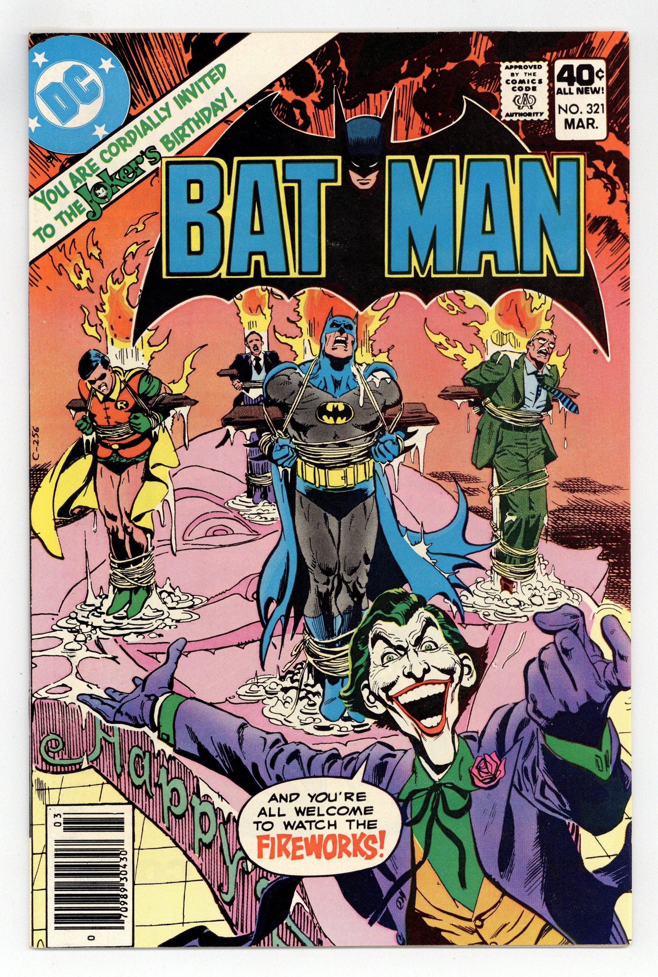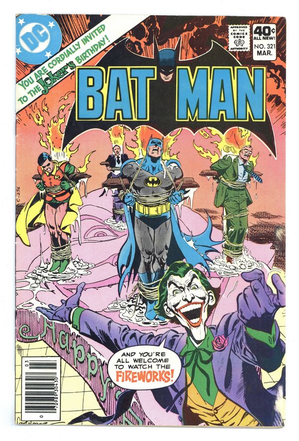 Cover by Jose Luis Garcia-Lopez. "Dreadful Birthday, Dear Joker...!", script by Len Wein, pencils by Walt Simonson, inks by Dick Giordano; The Joker celebrates his birthday by rounding up his enemies from all around town, including Robin, James Gordon, Selina Kyle, and Alfred Pennyworth; The Joker, after his plan is foiled, escapes on a speed boat. Hostess snack cakes ad starring Hawkman. Answer Man DC questions and answers by Bob Rozakis. Man-Bat parody strip by Fred Hembeck. 36 Pages, Full Color. Cover price $0.40.