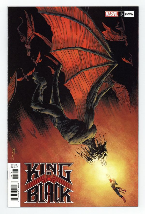 Tags: King in Black (part 3)$16.00Limited 1 for 50 Retailer Incentive Variant Cover. Written by Donny Cates. Art by Ryan Stegman and JP Mayer. Cover by Declan Shalvey. After last issue's shocking finale, the heroes of the Marvel Universe are reeling. Outgunned and outmanned, but never outdone, they unite and face KNULL, God of the Abyss, as he ensnares the planet in the darkness of his reign! Superstars DONNY CATES and RYAN STEGMAN continue to raise the game - and the stakes for the Marvel Universe in this Earth-shattering epic! 40 pages, full color. Rated T+ Cover price $4.99.