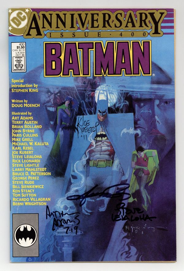 Direct Edition. 2-page introduction by Stephen King. As Batman ponders the note 'Know Your Foes' sent to him as a warning, all of his foes are sprung from Arkham Asylum in "Resurrection Night!" Script by Doug Moench. Art by John Byrne (1 page), Steve Lightle & Bruce D. Patterson (6 pages), George Perez (4 pages), Paris Cullins & Larry Mahlstedt (3 pages), Bill Sienkiewicz (7 pages), Arthur Adams & Terry Austin (8 pages), Tom Sutton & Ricardo Villagran (6 pages), Steve Leialoha (3 pages), Joe Kubert (4 pages), Ken Steacy (3 pages), Rick Leonardi & Karl Kesel (6 pages), Brian Bolland (9 pages). Plus: pin-ups by Mike Grell, Michael W. Kaluta, Bernie Wrightson, Steve Rude. Cover by Bill Sienkiewicz. 68 Pages, Full Color. Cover price $1.50.