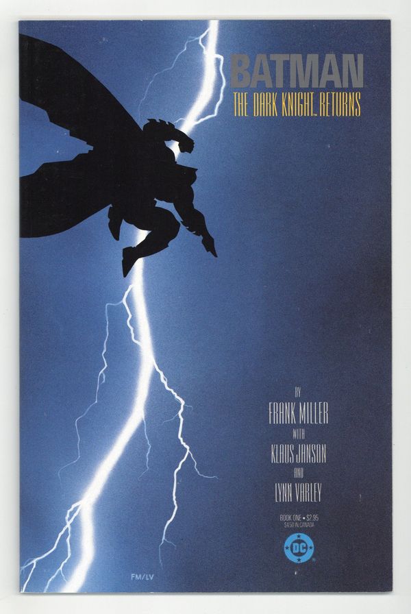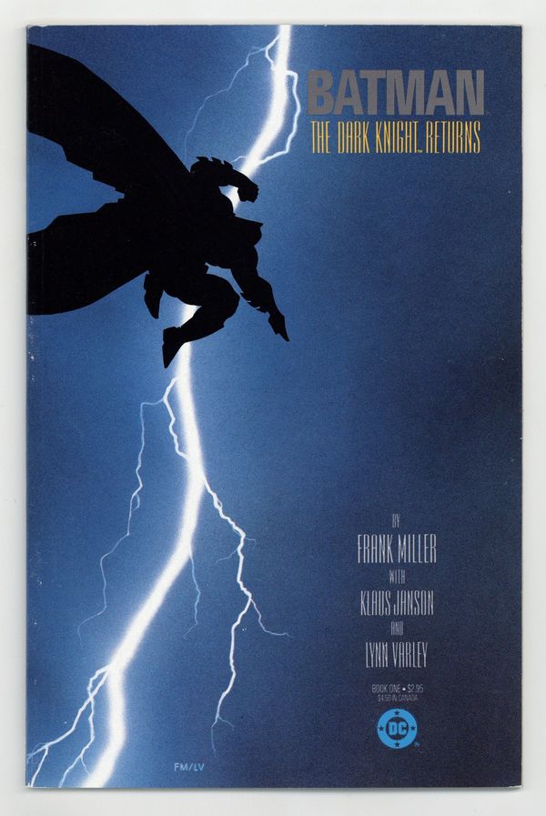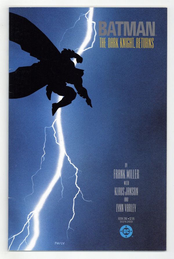 Tags: Batman$125.001st printing. NOTE: 2nd, 3rd, and 4th printings of #1 are labeled as such on the inside cover. Cover by Frank Miller. "The Dark Knight Returns," script and pencils by Frank Miller, inks by Klaus Janson; Set 20 years in the future, this story finds that in the absence of superheroes, criminals have run amok, and a gang called the Mutants are terrorizing Gotham City; Bruce Wayne has been retired from super-heroing for 10 years following the death of Jason Todd, the second Robin; Despite Wayne's funding of the rehabilitation of Harvey Dent (Two-Face), Dent returns to being a super-villain; Bruce, overcome with the grief over what Gotham has become, dons the Batman costume again and captures Dent. 52 pgs., full color. Cover price $2.95.