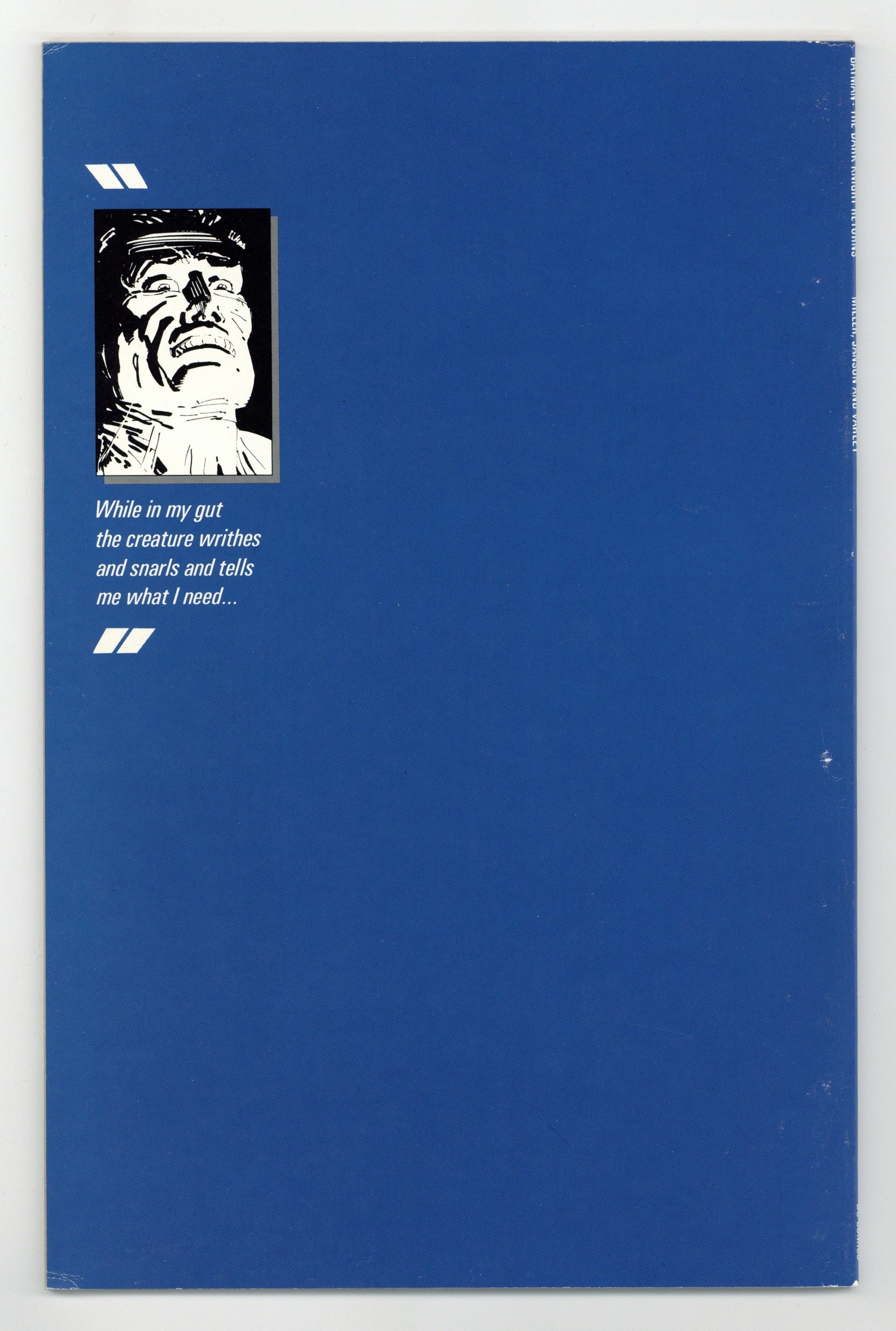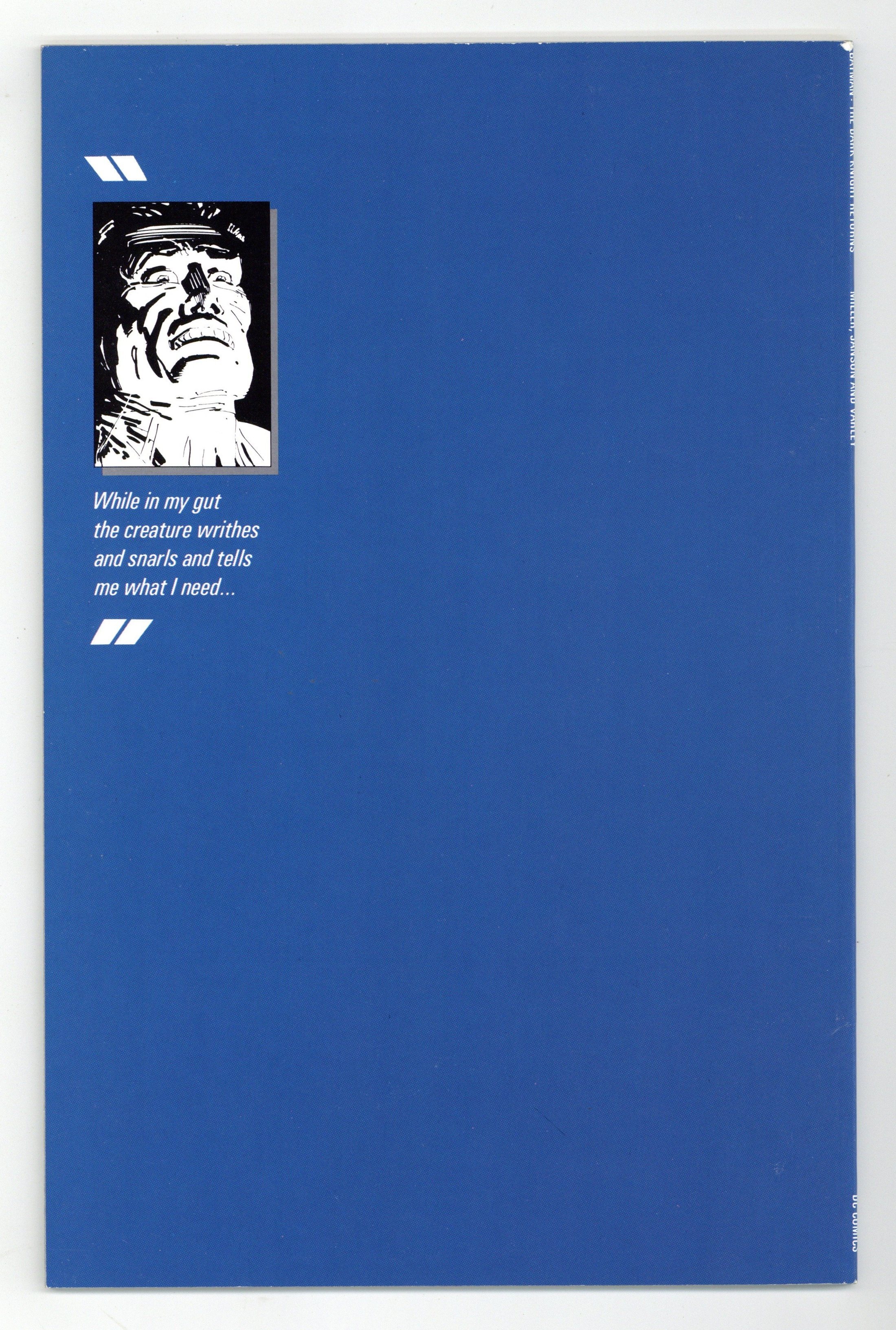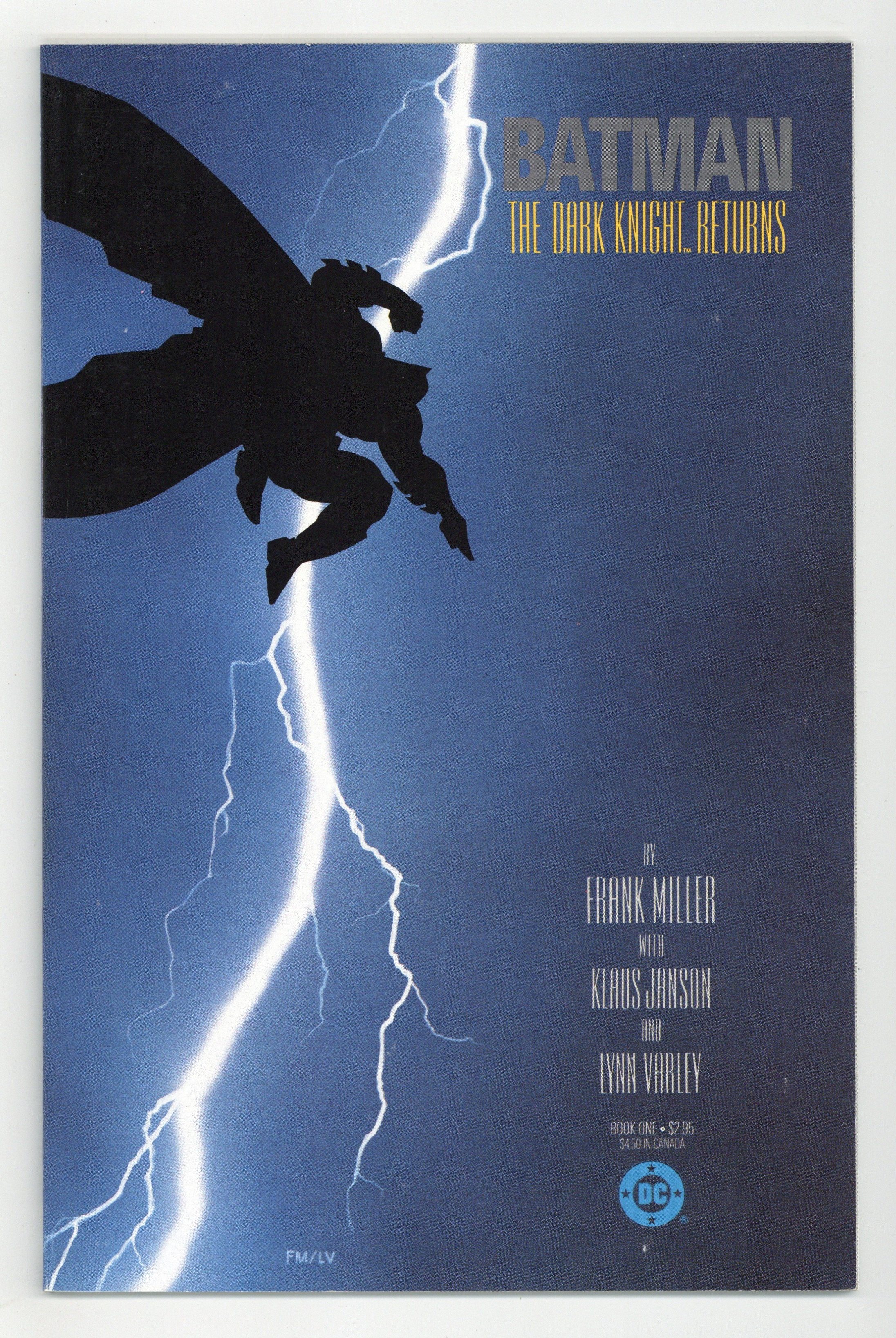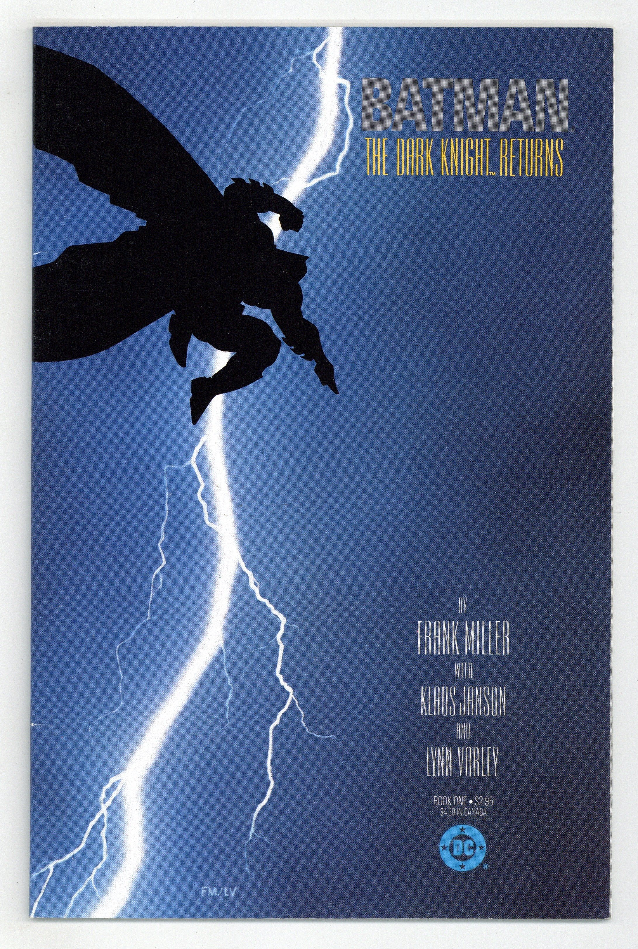 Tags: Batman$96.001st printing. NOTE: 2nd, 3rd, and 4th printings of #1 are labeled as such on the inside cover. Cover by Frank Miller. "The Dark Knight Returns," script and pencils by Frank Miller, inks by Klaus Janson; Set 20 years in the future, this story finds that in the absence of superheroes, criminals have run amok, and a gang called the Mutants are terrorizing Gotham City; Bruce Wayne has been retired from super-heroing for 10 years following the death of Jason Todd, the second Robin; Despite Wayne's funding of the rehabilitation of Harvey Dent (Two-Face), Dent returns to being a super-villain; Bruce, overcome with the grief over what Gotham has become, dons the Batman costume again and captures Dent. 52 pgs., full color. Cover price $2.95.
